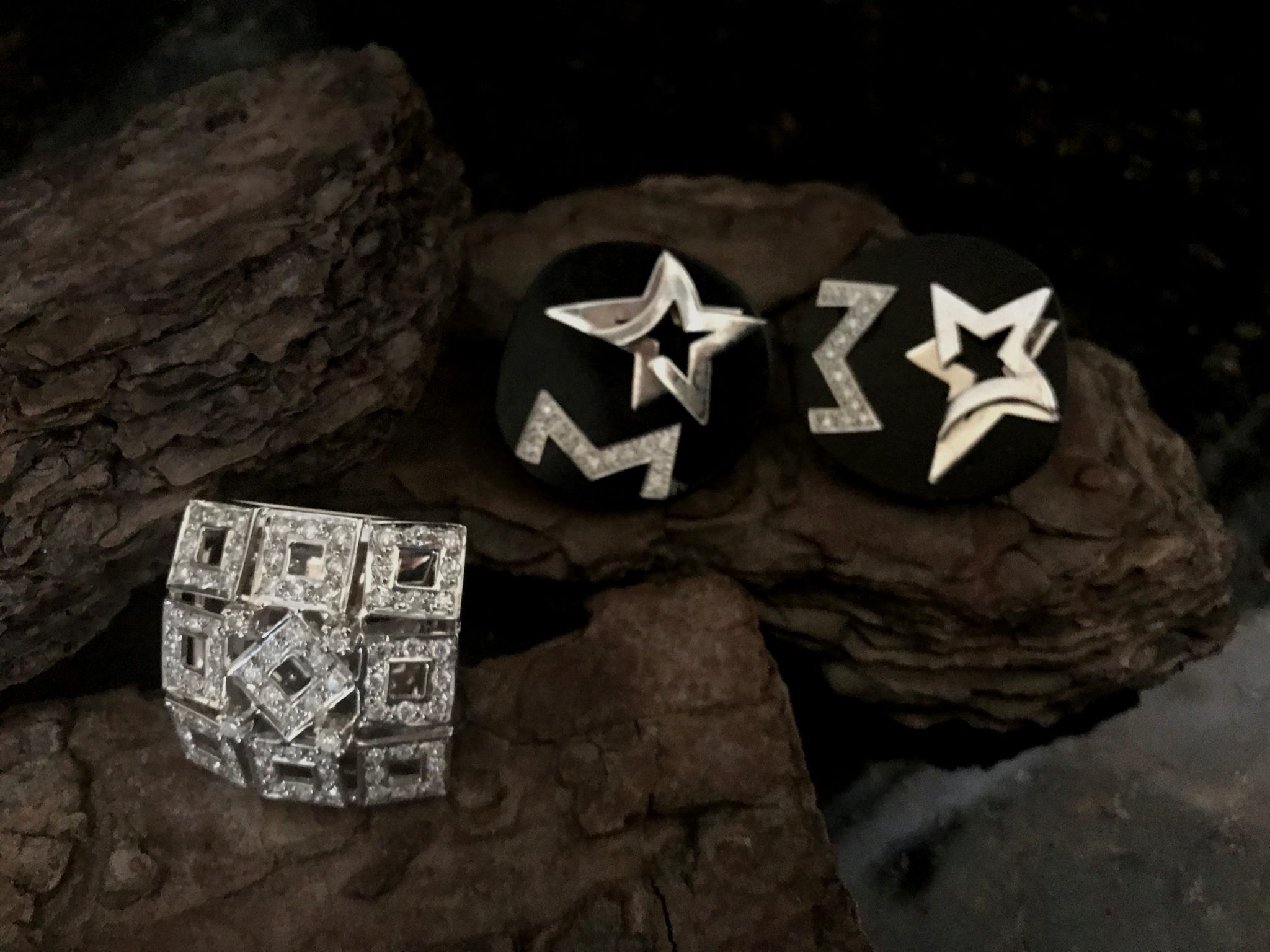 – Para fazer um mix de estampas discreto, opte por combinar uma peça estampada com um acessório também estampado, como: sapatos, bolsas, cintos ou lenços, por exemplo. ( Ao trazer a estrela para a joia, brinquei com a forma geométrica. Com isso, o anel geométrico entrou na composição “conversando” com ela! )
