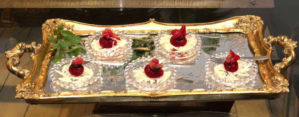 trouxinhas de carpaccio com beterraba e wasabi, lasca de parmesão