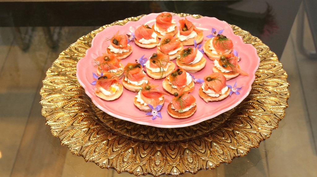 mini blinis com flor de salmão defumado e maracujá