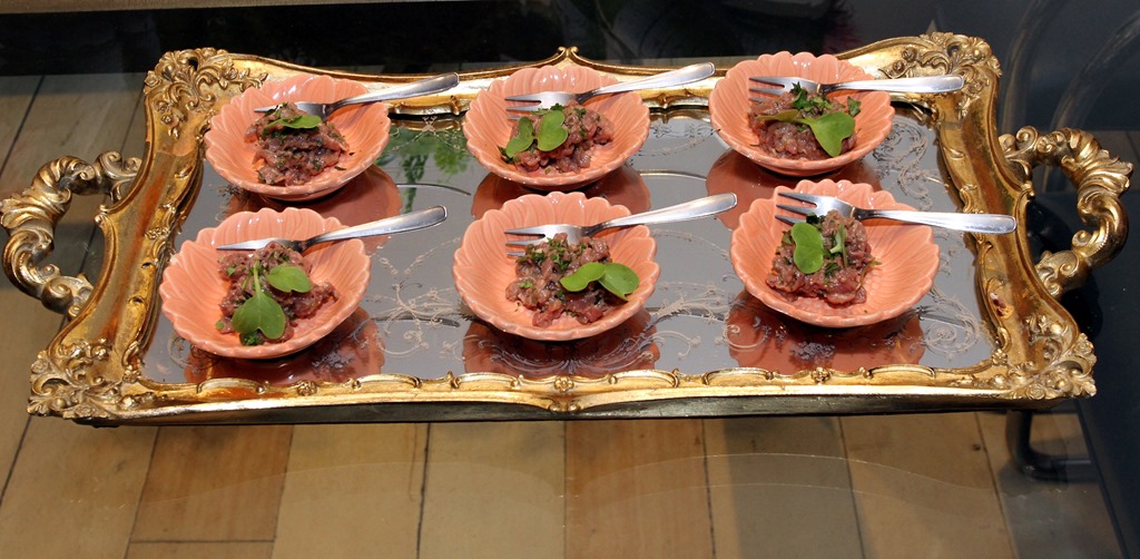 mini steak tartar servido na flor cor de rosa