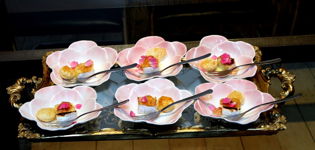 queijo brie maçaricado com geléia de rosas, folhadinho e rosinhas comestíveis