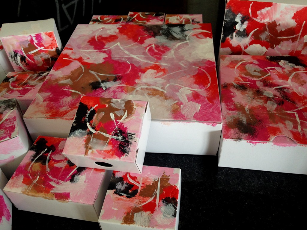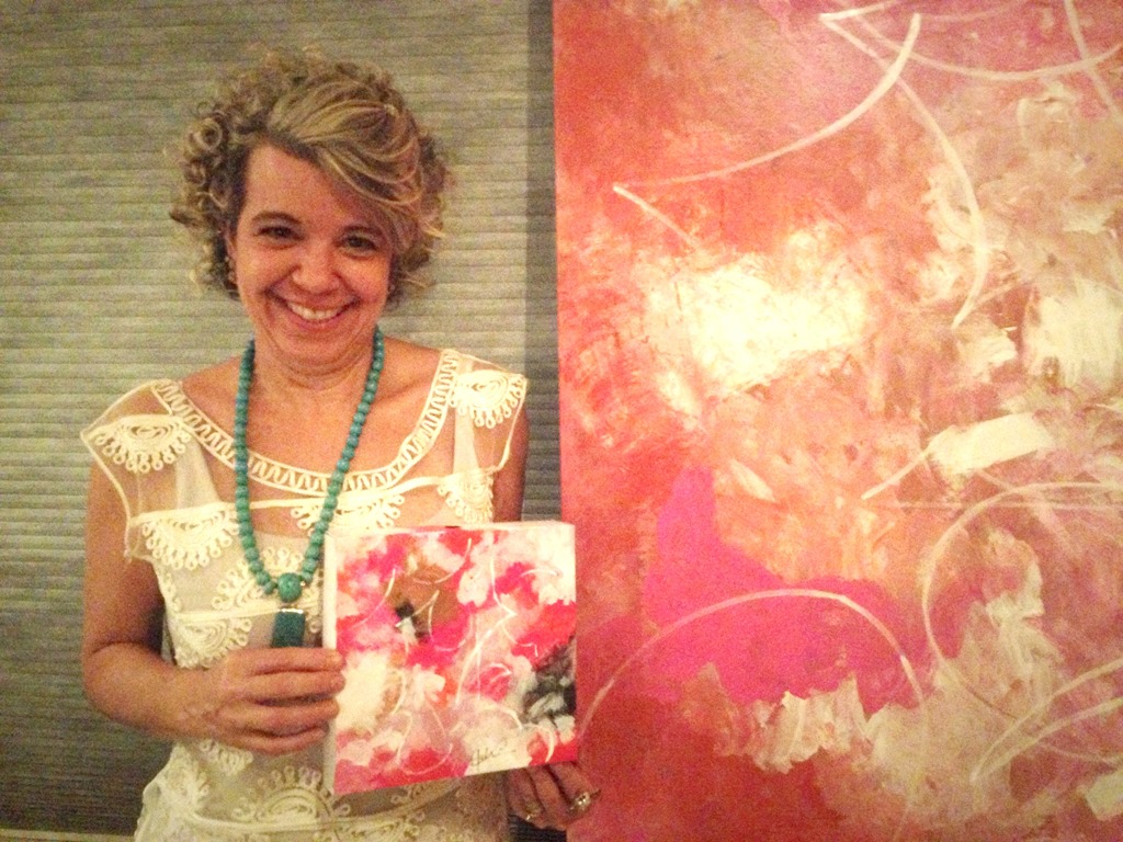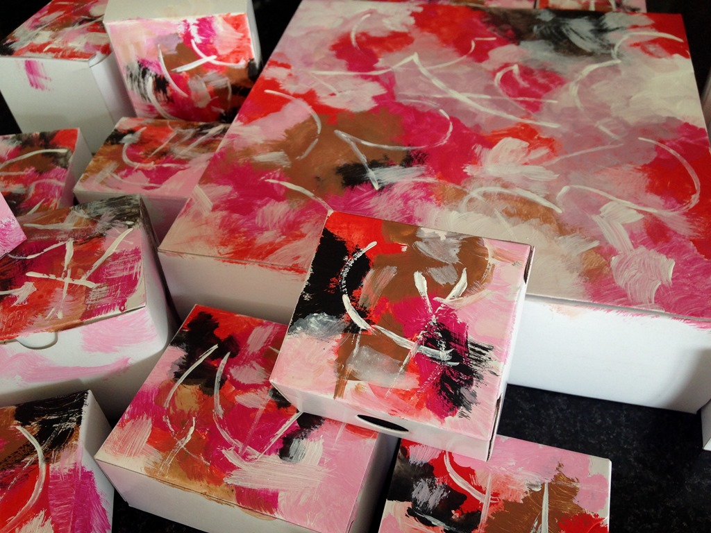 Em resumo, pintei essas caixinhas a mão , uma a uma , inspiradas em um quadro que eu também havia pintado há uns 20 anos atrás. Aproveitei o evento rosa e dessa forma , desci com ele para a sala, funcionando como painel. Aiinda assim flagrei  Denise com sua caixinha personalizada.