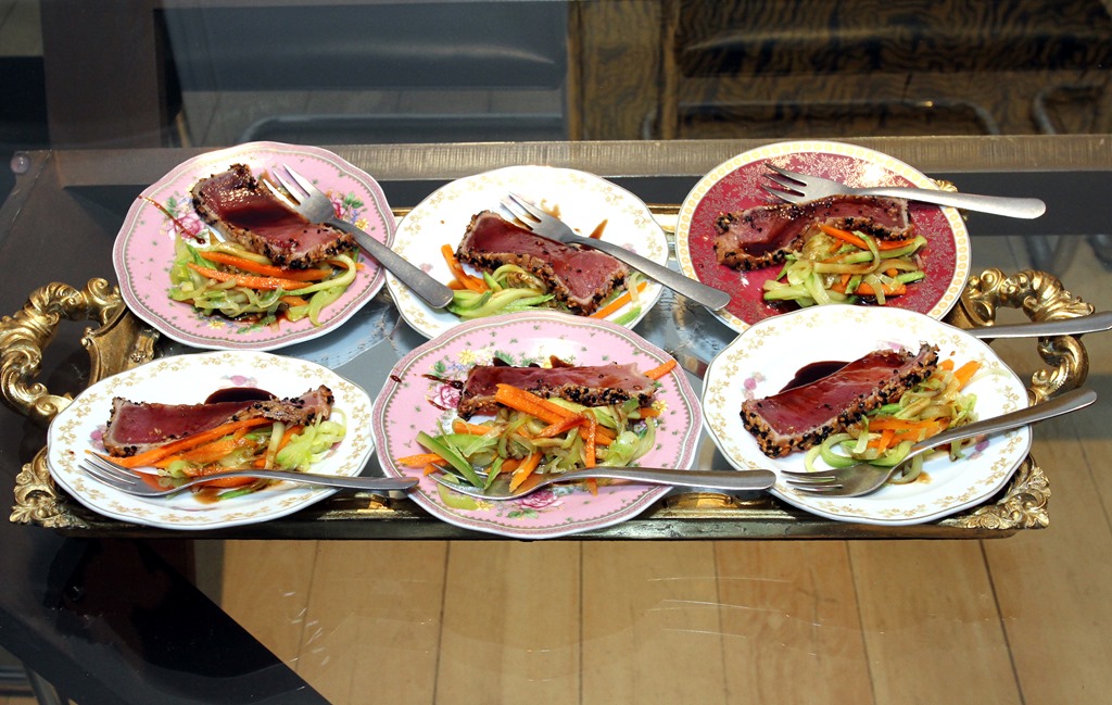atum selado crosta de gergelim sobre espaguete de legumes