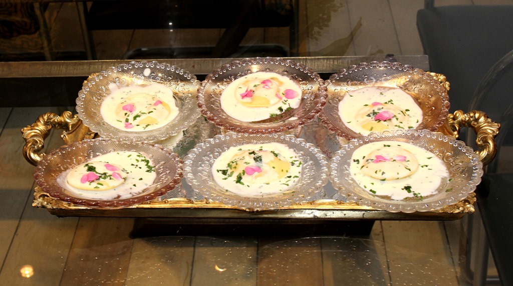 raviolinis rosa de ovo de codorna trufado, mascarpone de ervas
