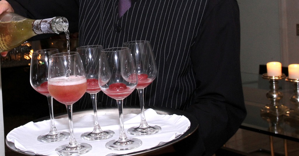 suco de maçã e cranberry no copinho de vodka e sorbet de framboesa ( no palito ) servido ’emborcado’ no espumante