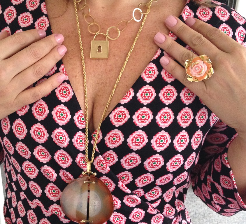 Aqui, em frente ao quadro rosa – o que inspirou as caixinhas – e no detalhe , a estampa do vestido com fundo rosa.