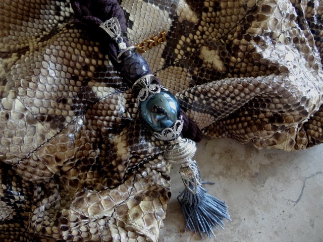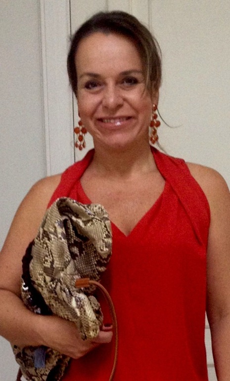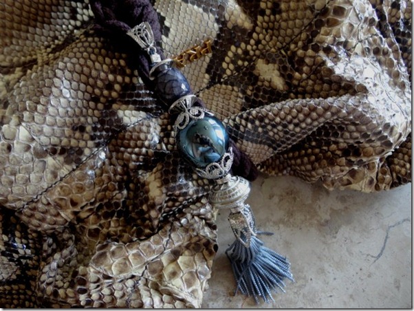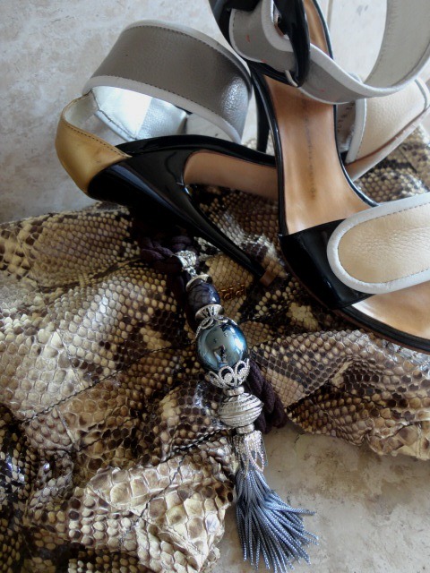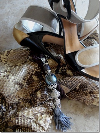 top e calça TAHARI – cinto TOMMY HILFINGER – sandália GIUSEPPE ZANNOTTI – bolsa saco de python PRADA amarrada com um tassel para ser usada como clutch
