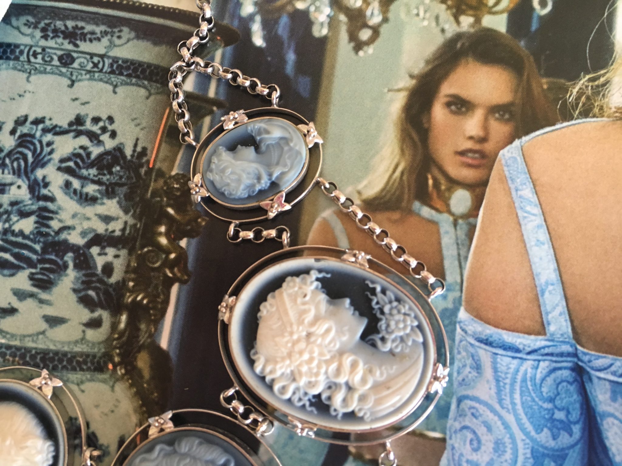 Repare na jóia que a Alessandra Ambrósio usou na foto: um camafeu clássico que nunca sai de moda! Esse colar de camafeus azuis JOIAS PD caiu como uma luva nessa cartela de cores !