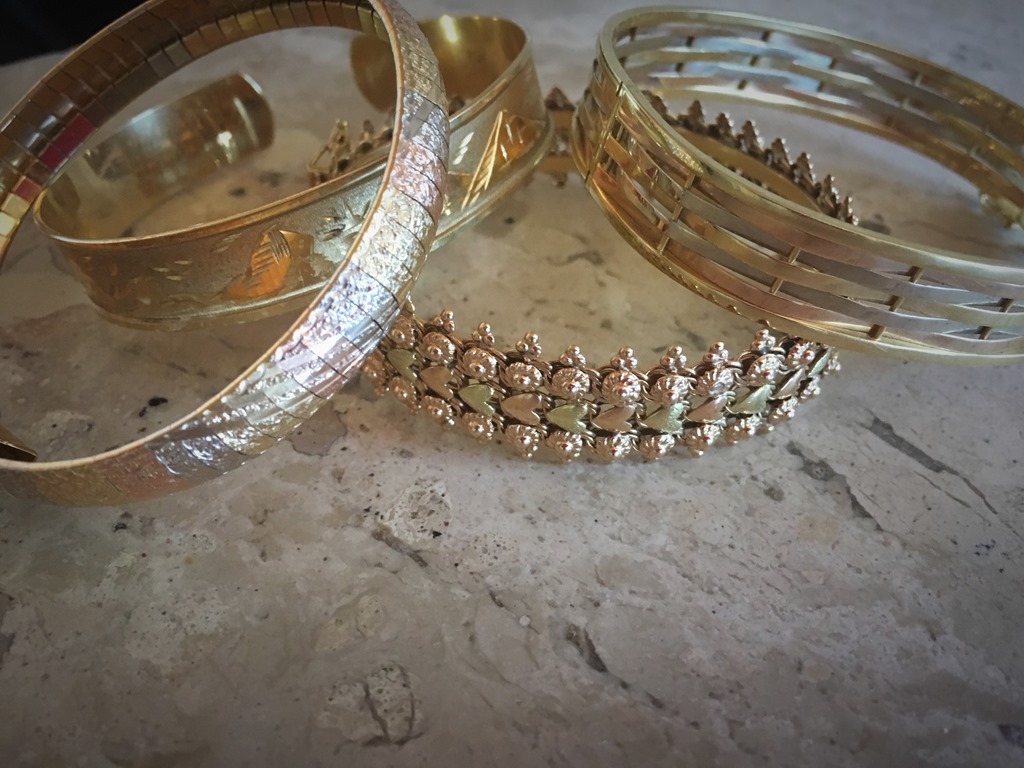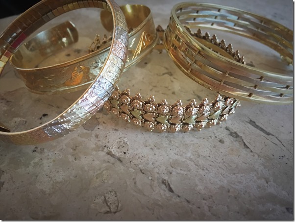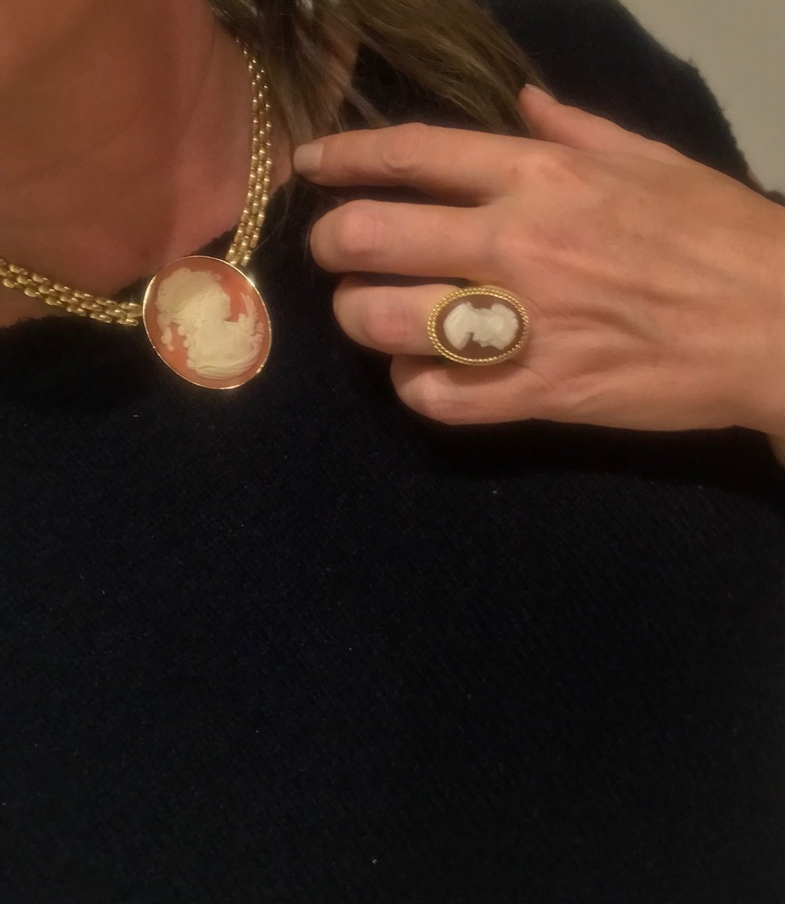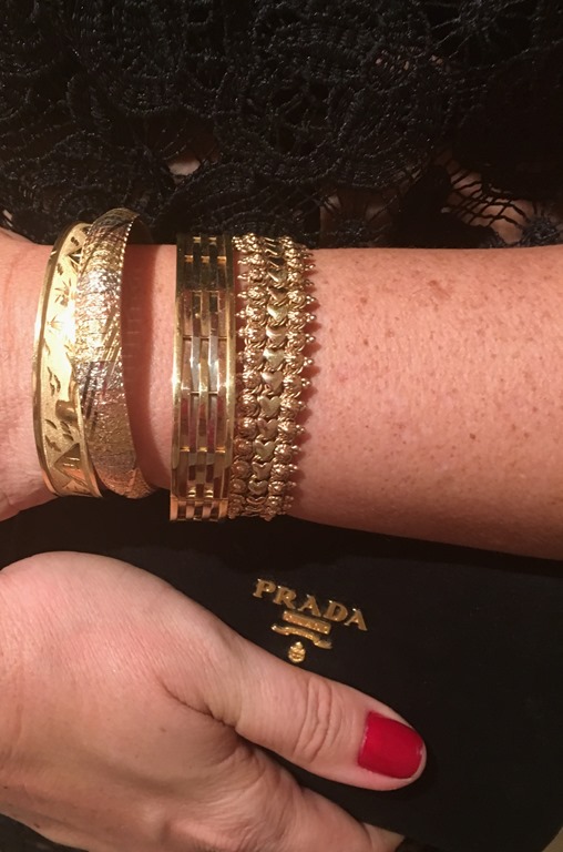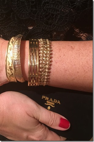 Conjunto de camafeus – essas foram as jóias escolhidas para compor esse look “ Dolce Gabbana Style “ – e mais braceletes em ouro amarelo , todos na mesma mão.