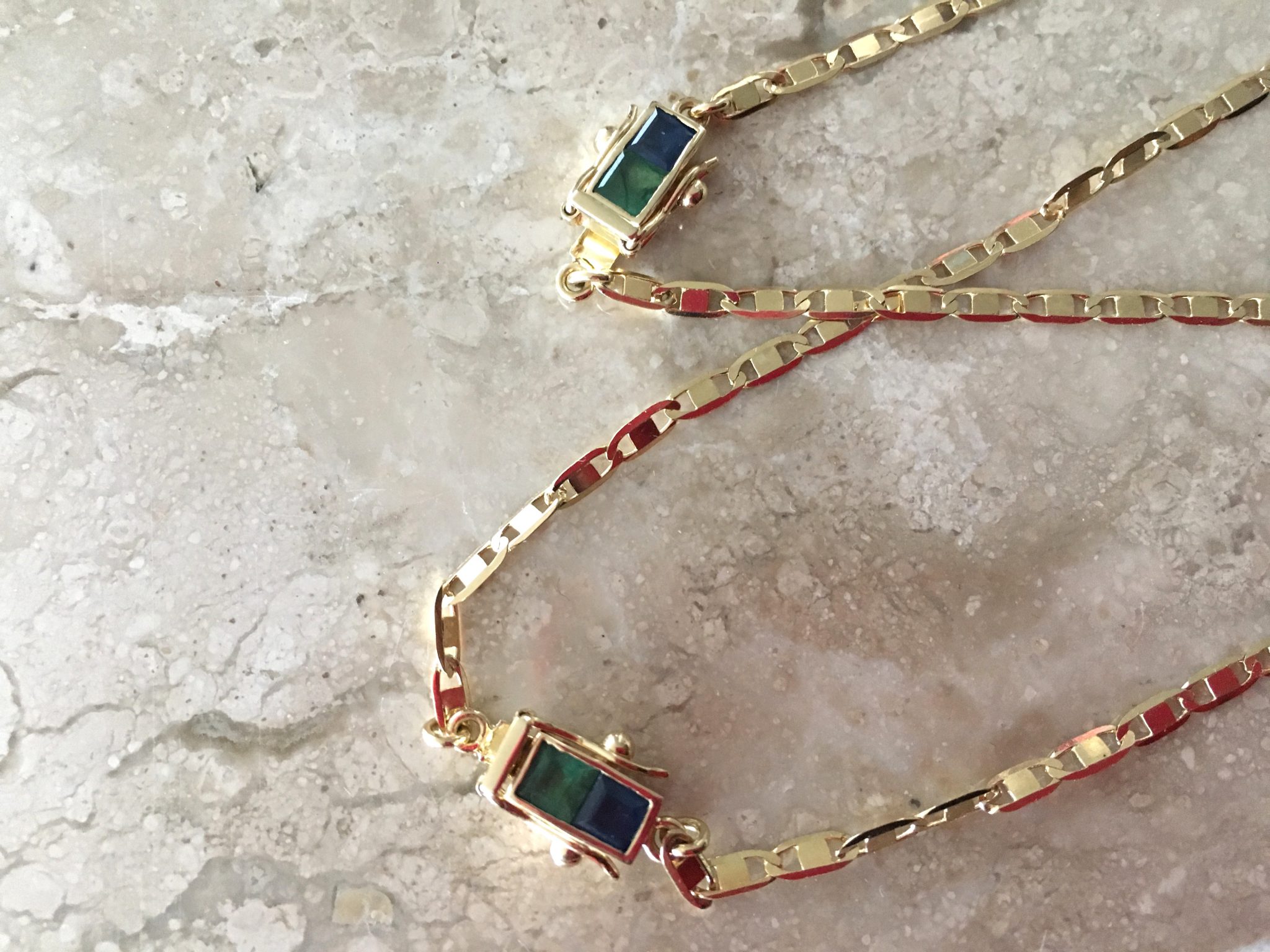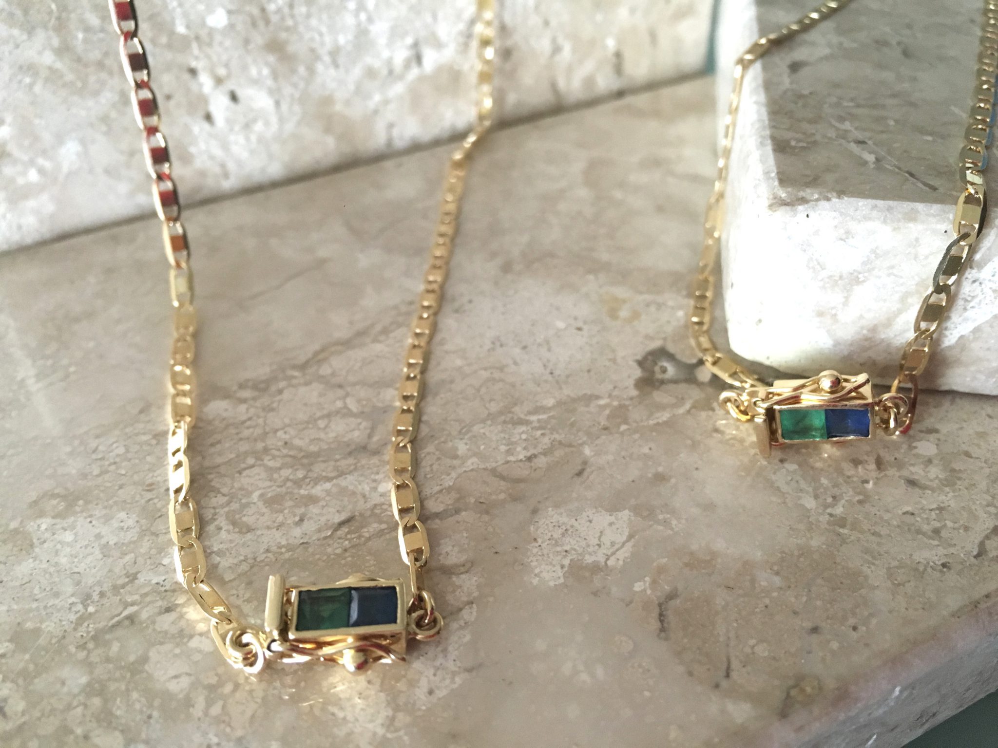 Como gostam de safira e esmeralda, pensei em 2 correntes iguais com as pedras preferidas unidas , como se as 2 metades estivessem eternamente ligadas.