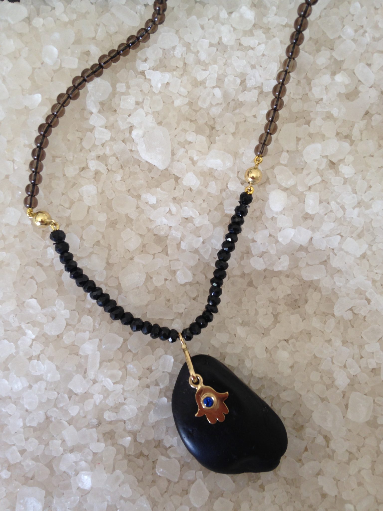 Essa peça acima é design exclusivo JÓIAS PD e foi desenvolvida a partir dessas pedras vulcânicas recolhidas por mim mesma, pessoalmente , na praia de Santorini, como já mostrei AQUI . Como vieram da Grécia, acrescentei ainda mais significado com essa Mão-de-Fátima, que para quem acredita, funciona como um amuleto contra o mau-olhado. Fica aí mais uma historinha para contar, que pelo que parece, está ” na crista da onda ” !