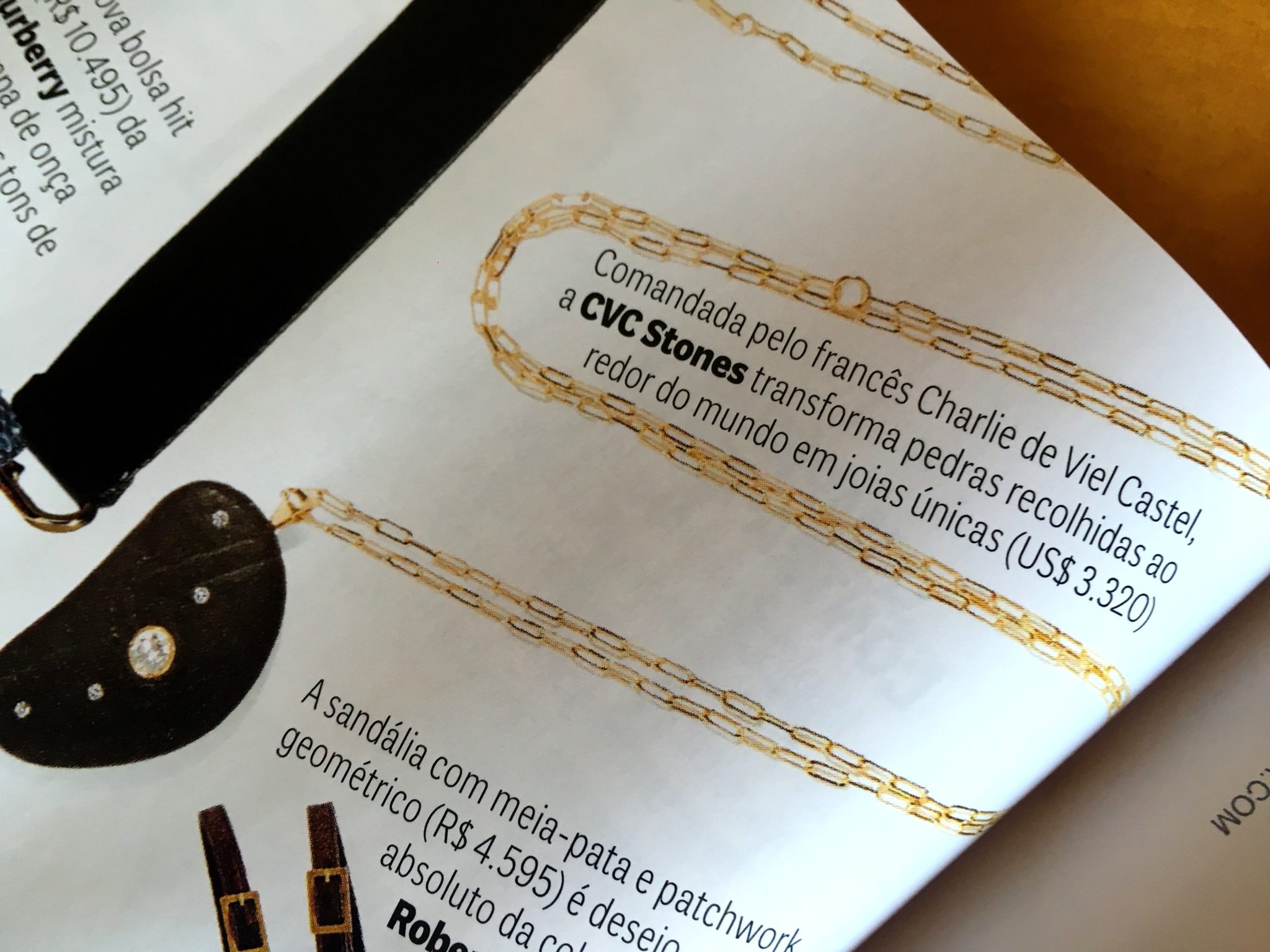 Donata Meirelles, uma das cabeças que faz da VOGUE BRASIL uma das mais respeitadas do mundo, tem uma página de tendências em que ela aponta o que é ( ou vai ser! ) desejo absoluto. Nessa Vogue de outubro/2016, ela mostrou essa joalheria CVC STONES que faz peças autorais a partir de pedras catadas ao redor do mundo.