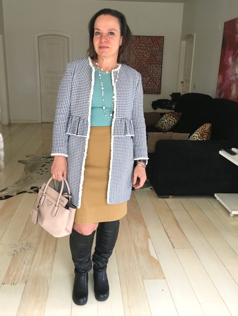 Nessas 2 propostas, a estética ” Chanel” foi preservada, mantendo uma aura clássica, mesmo sendo looks casuais. O mesmo casaco longo foi mantido, e sapato baixo em ambos, pois era dia de trabalho.