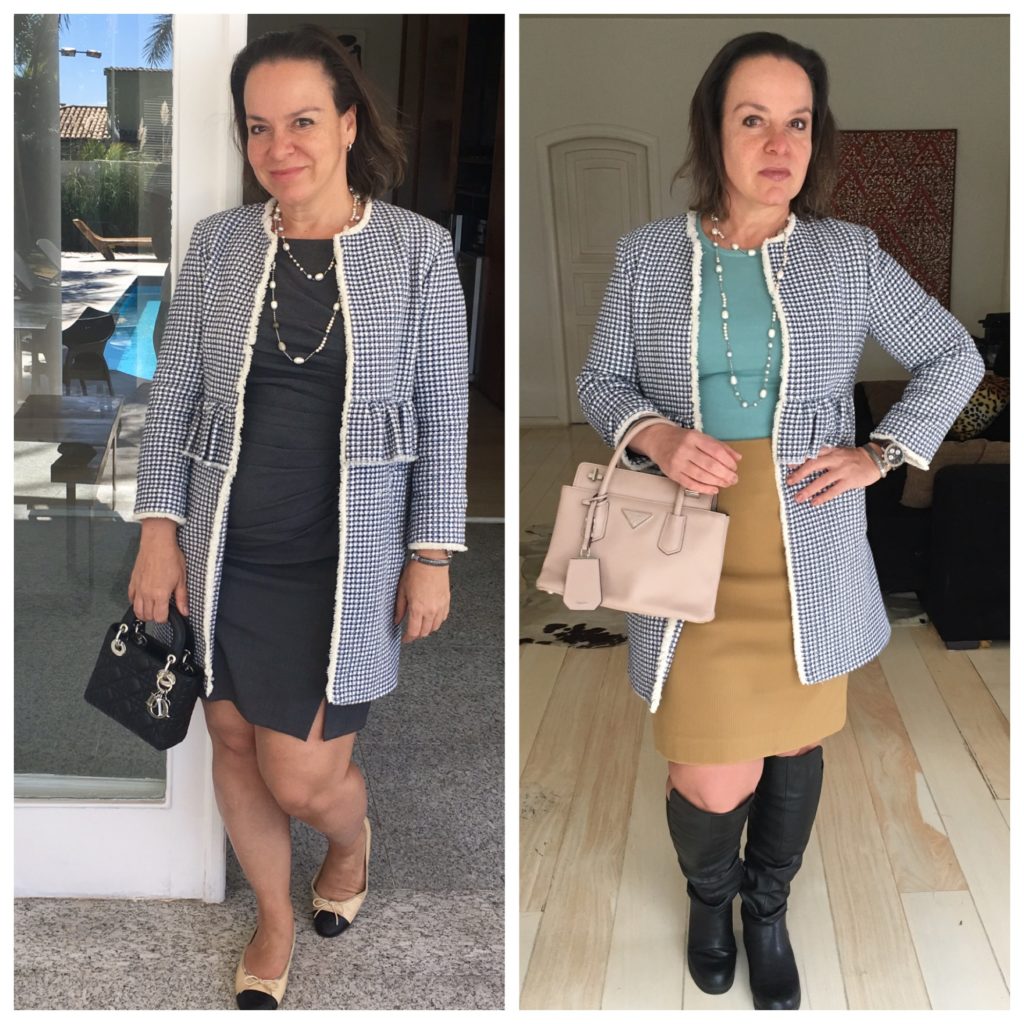Nessas 2 propostas, a estética ” Chanel” foi preservada, mantendo uma aura clássica, mesmo sendo looks casuais. O mesmo casaco longo foi mantido, e sapato baixo em ambos, pois era dia de trabalho.