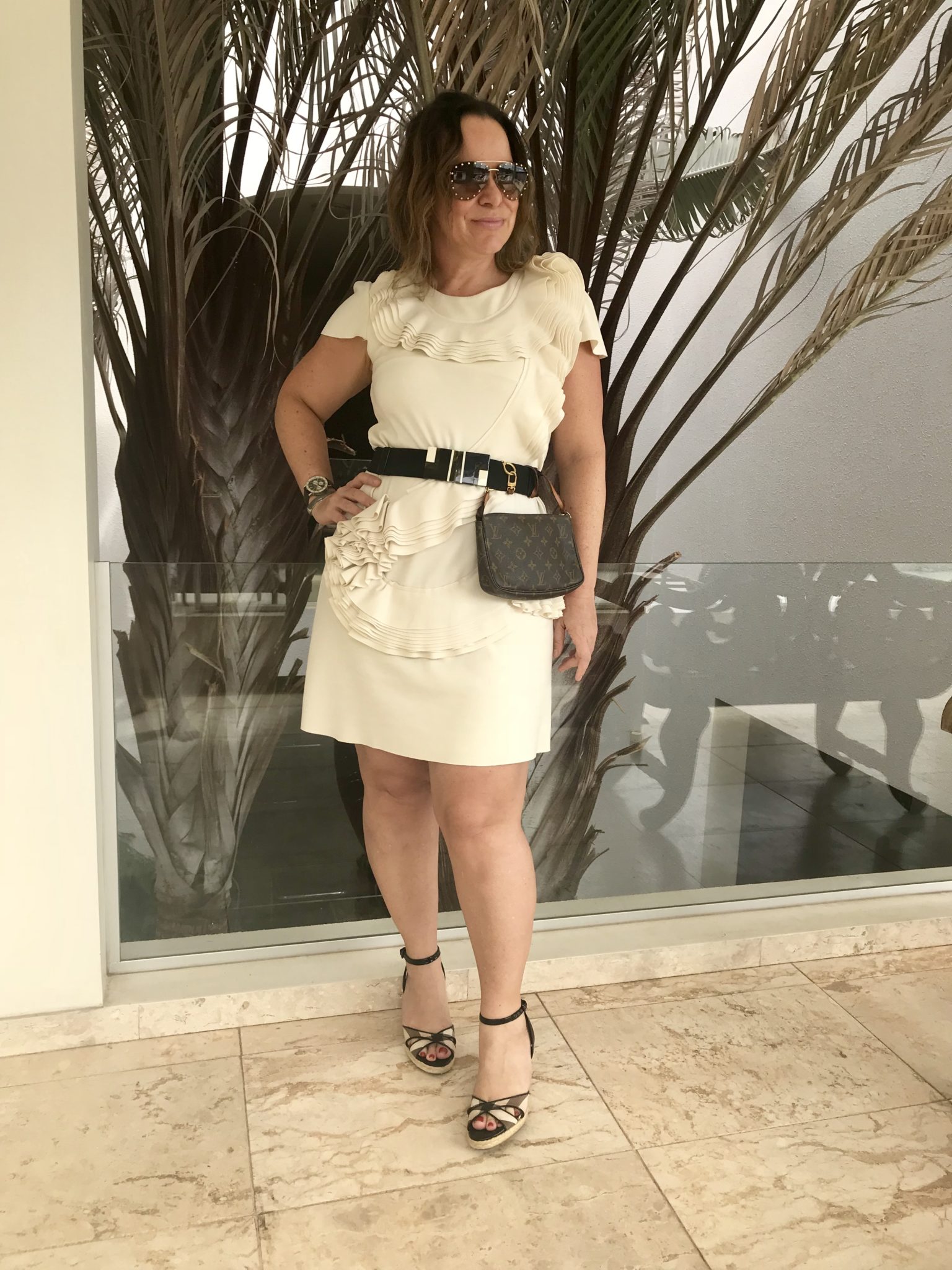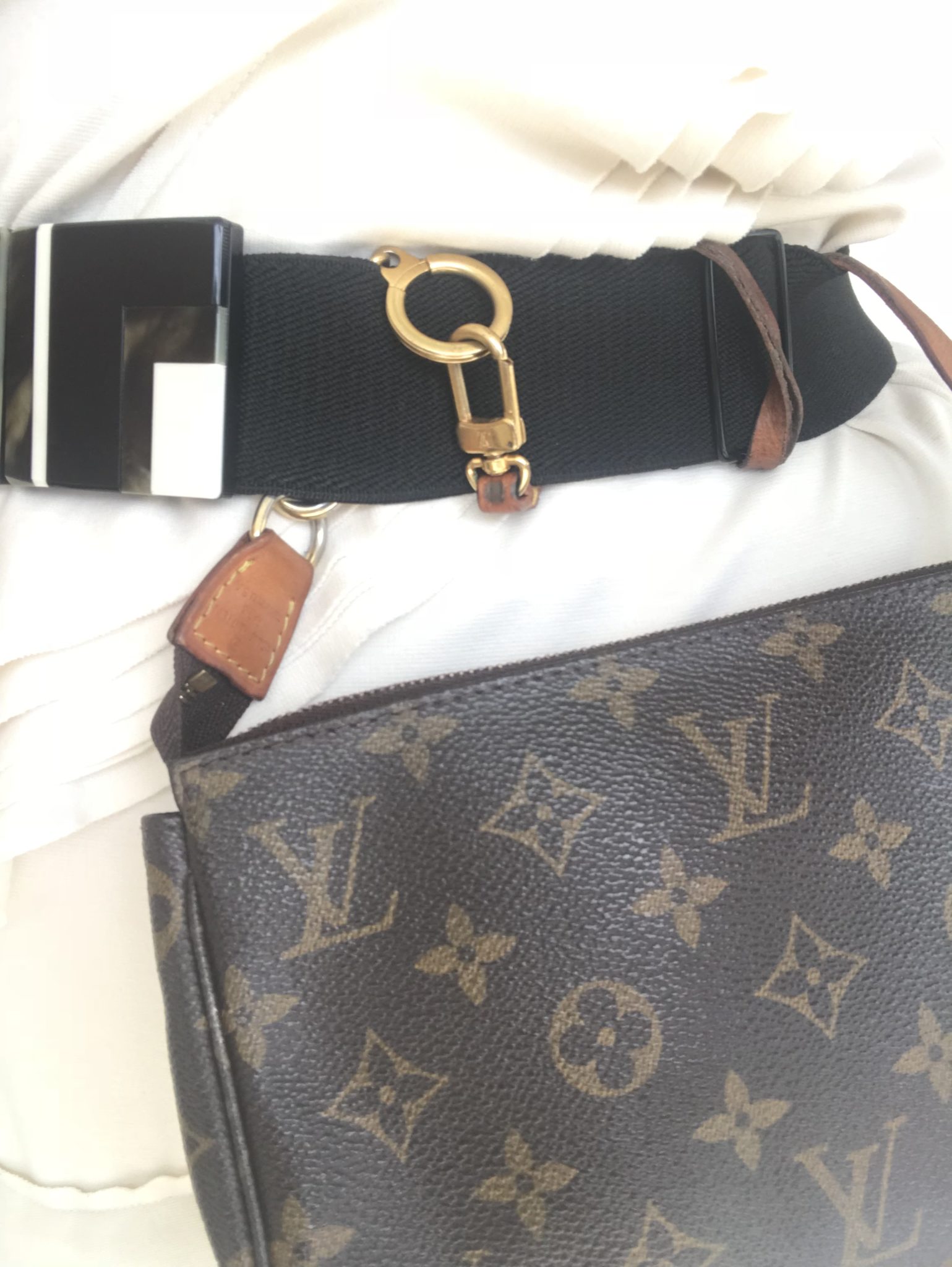 O que eu fiz então? Já que eu queria apenas fazer essa brincadeira com a moda, eu enrolei a minha bolsinha Louis Vuitton antiquíssima em um cinto geométrico e fiz dessa a minha pochete momentânea.