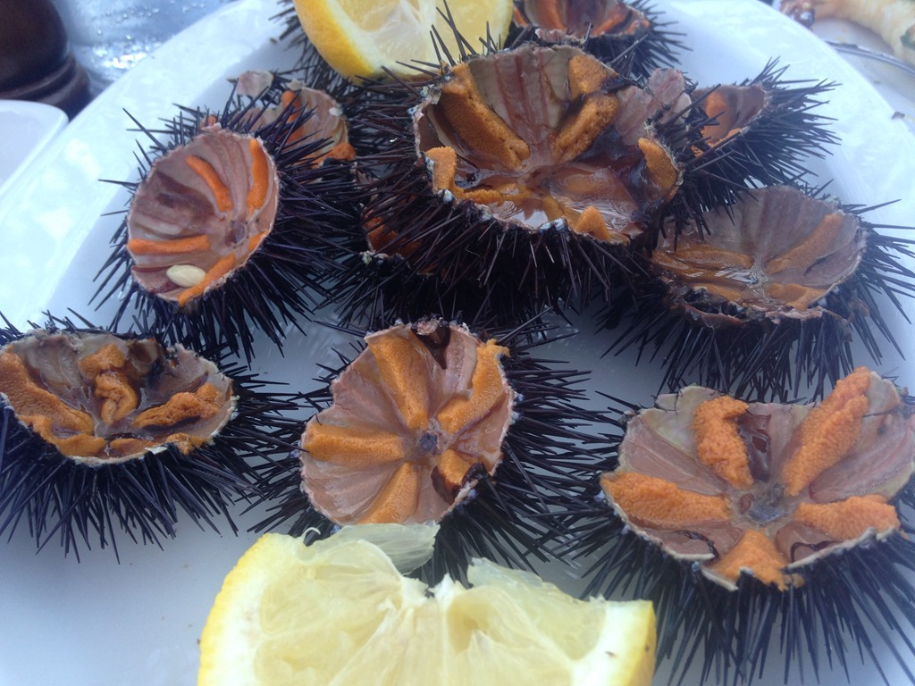 Claro que experimentamos a iguaria, minha 1a. vez! O que se come são essas ovas laranjas das fêmeas, com fio de azeite e limão siciliano! E vinho rosê é a pedida !