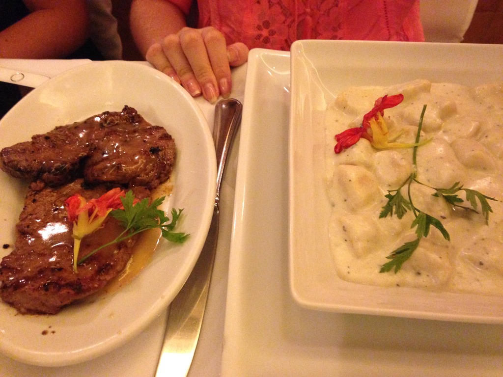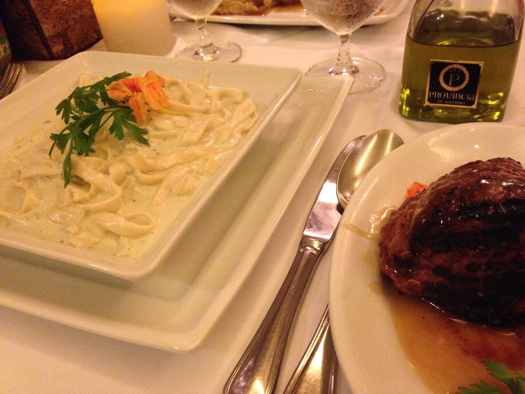 Os pratos giram na faixa de 45 a 60,00 cada – nas fotos, fetuccine ao gorgonzola com tornedor – nhoque aos 4 queijos com filé – risoto de funghi com filé – Uma delícia!