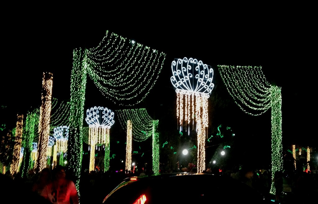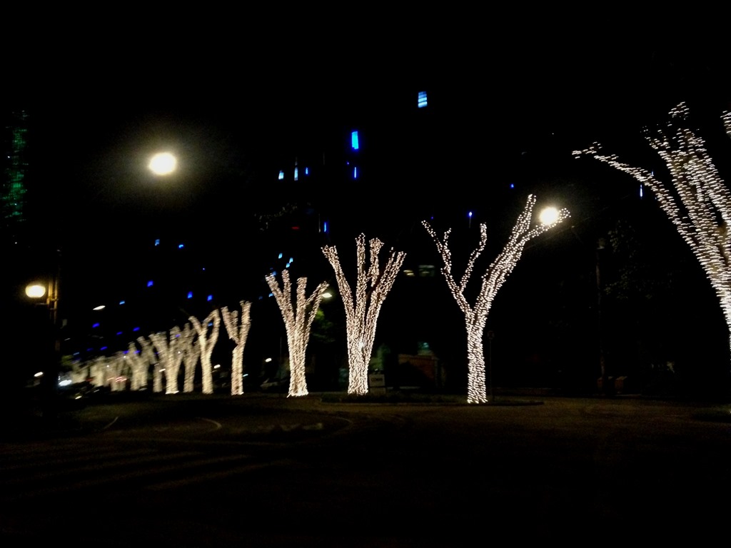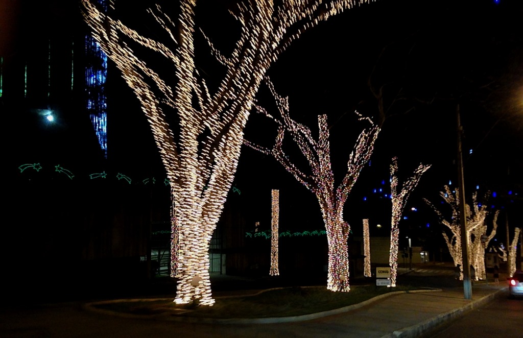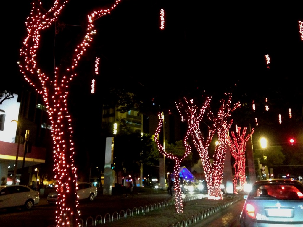 … e descemos a Avenida Afonso Pena, com bolas coloridas e o prédio dos Correios e da Prefeitura bem iluminados .