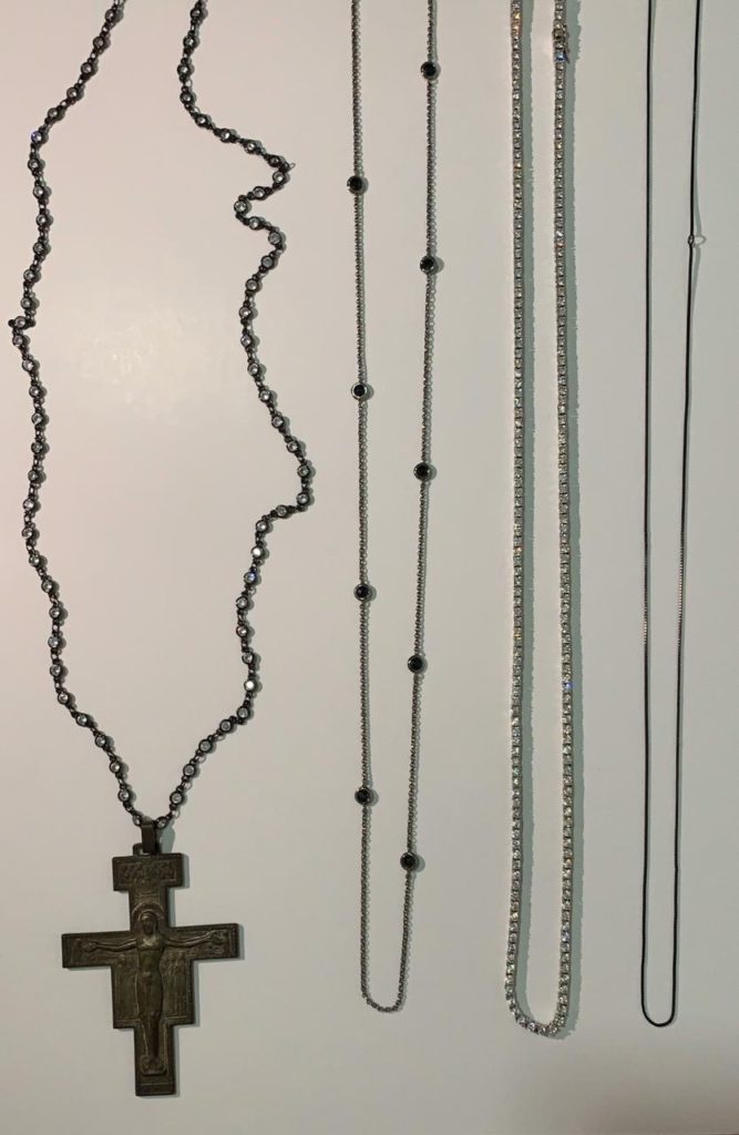 Quando a cruz é de antiquário, procuro modernizar no fio! Esses com pontos em diamante levantam qualquer visual! O único que não usaria de dia é a riviera toda em diamantes, acho exagerado e ostensivo!
