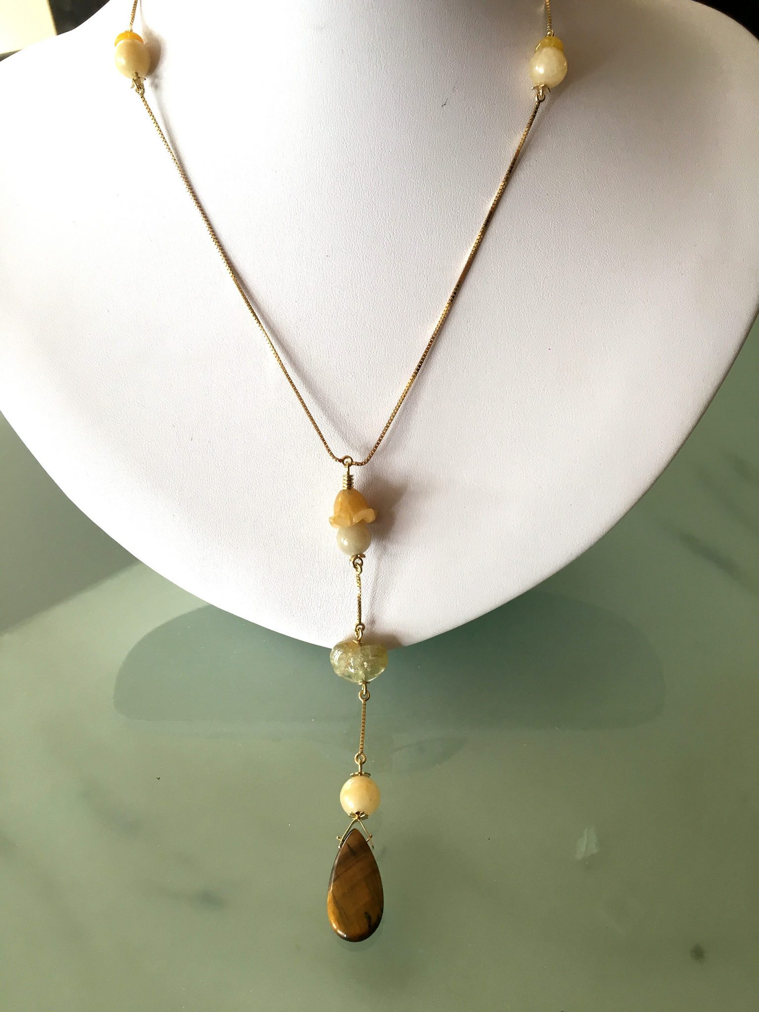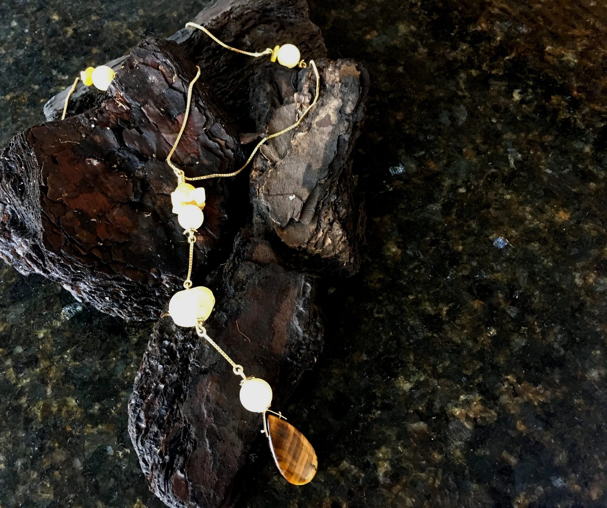 Funciona assim: um grupo se organiza para dar um presente-JOIAS PD e cada uma gasta o que já gastaria comprando seu presente individualmente. Entretanto, somando-se o montante de 6 ( ou mais! ), dá para escolher uma jóia bem linda e além disso, com a cara da pessoa que vai ganhar. Afinal, a escolha da vez foi esse colar em ágata, âmbar e olho de tigre, uma peça única com design exclusivo Jóias PD.