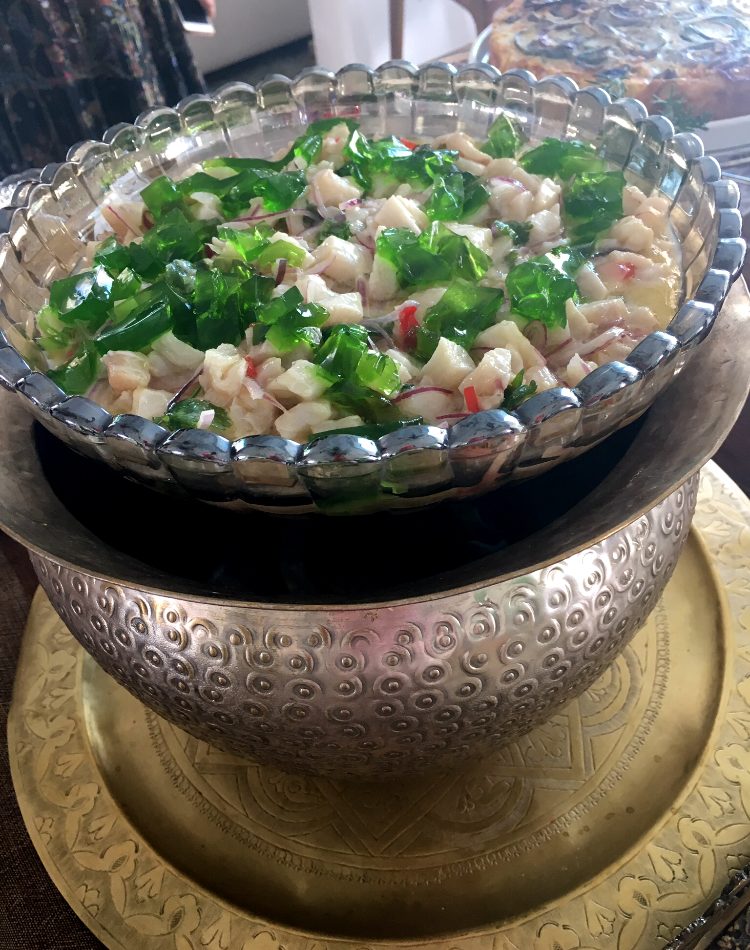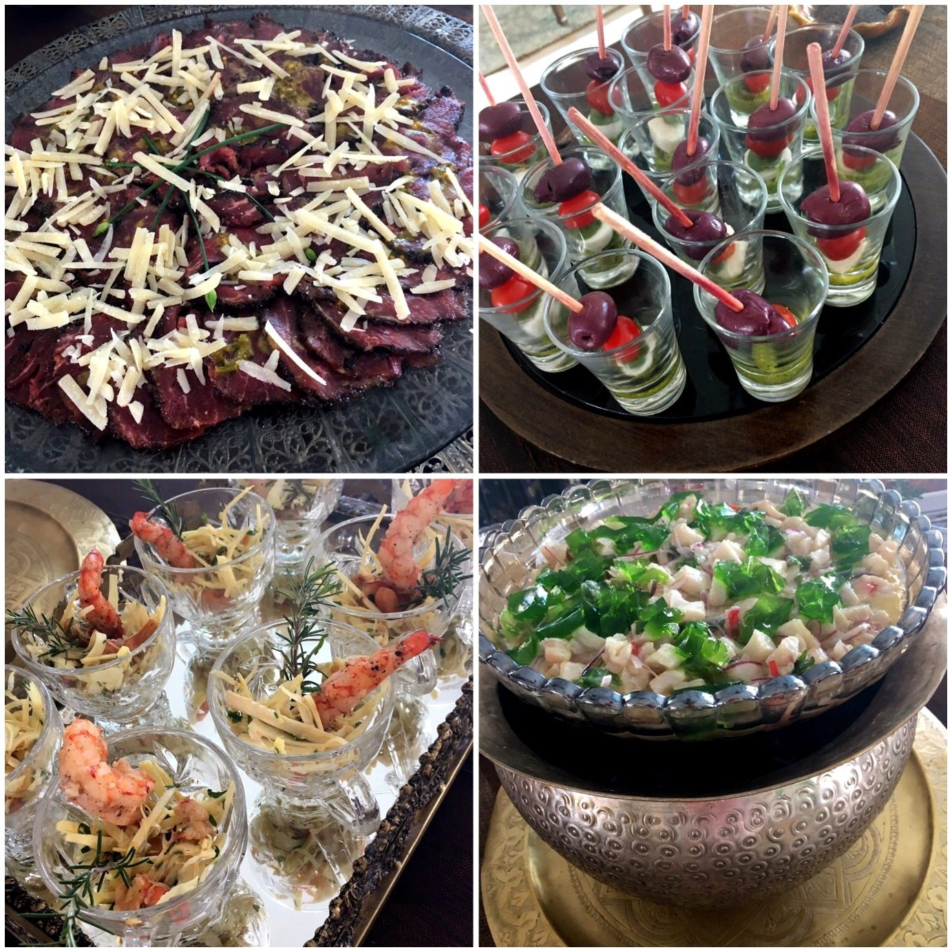 Rosbife de filé – saladinha caprese – Salada de pupunha com camarão e castanha – Ceviche de tilápia com gelatina de cachaça .
