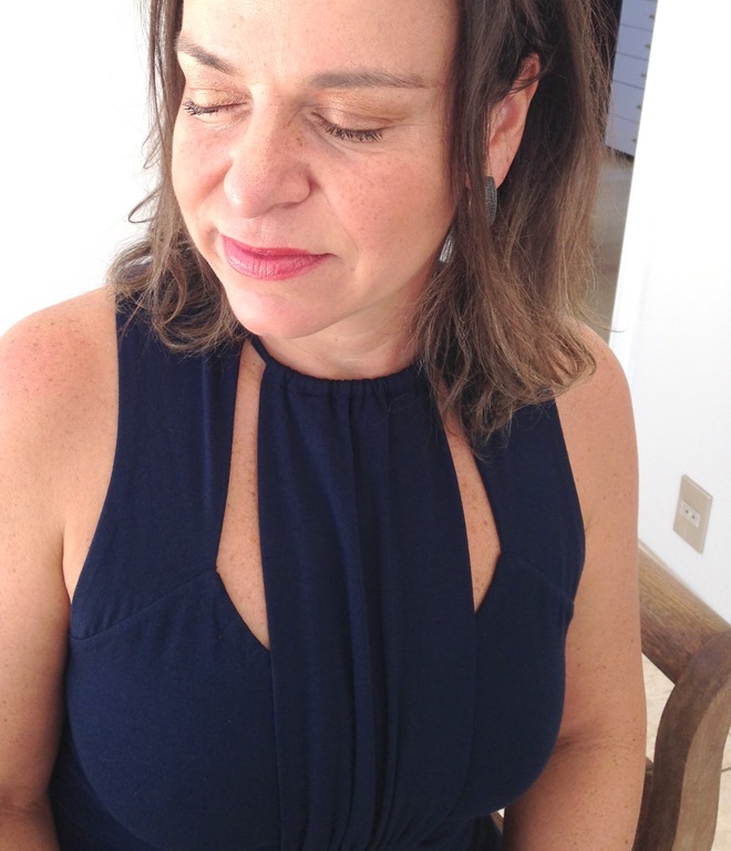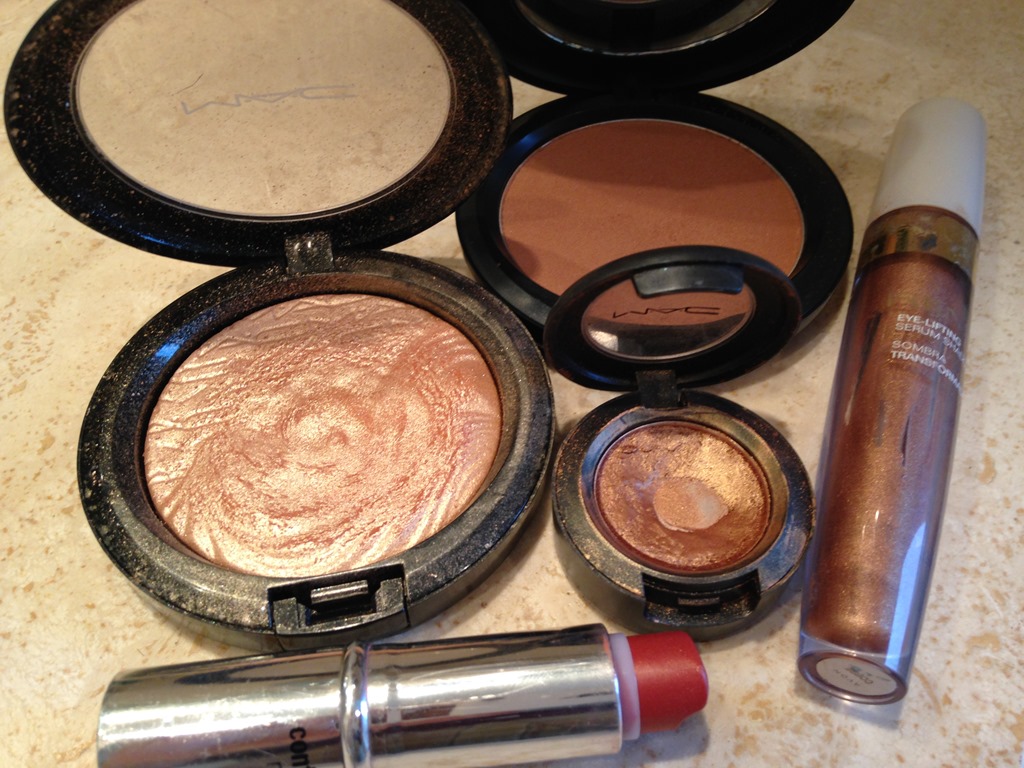 No olho, aplica-se sombra liquida dourada e por cima a sombra dourada em pó, com batidinhas leves com os dedos. Blush cobre , iluminador no osso da maçã, centro do nariz e abaixo da sombtrancelha, e um batom acobreado também.