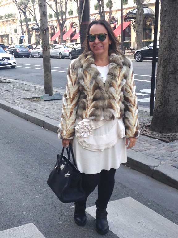 Dali siga a pé ( uma caminhadona! ) ou de táxi ( foi nossa opção por ser inverno ) em diração à Av Montaigne. Atravessando o lindo rio Sena, chega-se lá em um pulo. Usei vestido de malha BOBSTORE com meia grossa de inverno fio 80 tranquilamente, pois a temperatura ficou sempre entre 0 e 4 graus. Como não tinhas nem fortes ventos, nem chuva, uma 2a. pele debaixo do vestido + casaco de pele, era suficiente. E meia de lã nos pés, nem aparece na botinha. Essa foi a versão-dia para o mesmo vestido já usado antes à noite com salto e clutch.