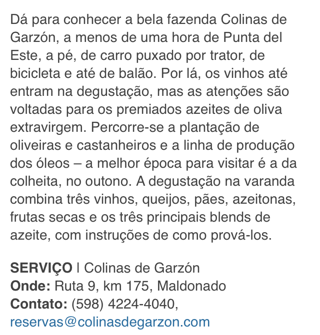 Um outro passeio a fazer na região é visitar esse povoado rural a 60 km de Punta del Este. A fazenda Colinas de Garzon produz o único azeite extravirgem do Uruguai com selo de qualidade DOC , e é em torno dele e das oliveiras que a visita se orienta.