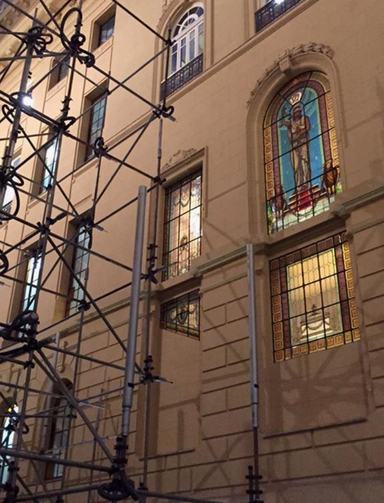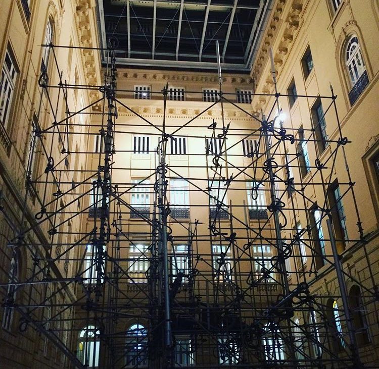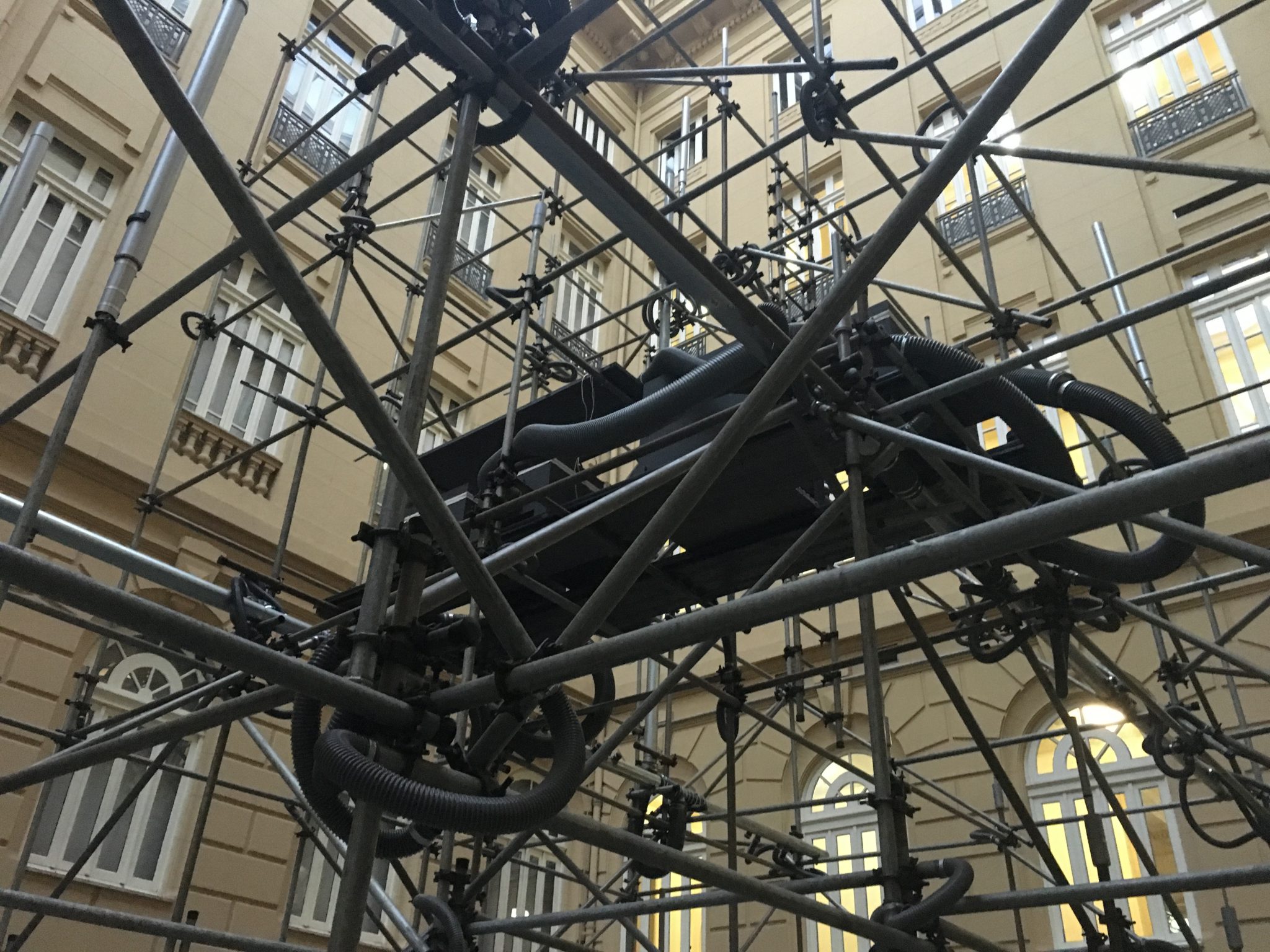 Fiquei super maravilhada com essa estrutura de andaimes que Nuno pensou e executou para esse local específico. Um órgão suspenso controlado por computadores propagava o som por dentre os tubos dos andaimes. Um show!