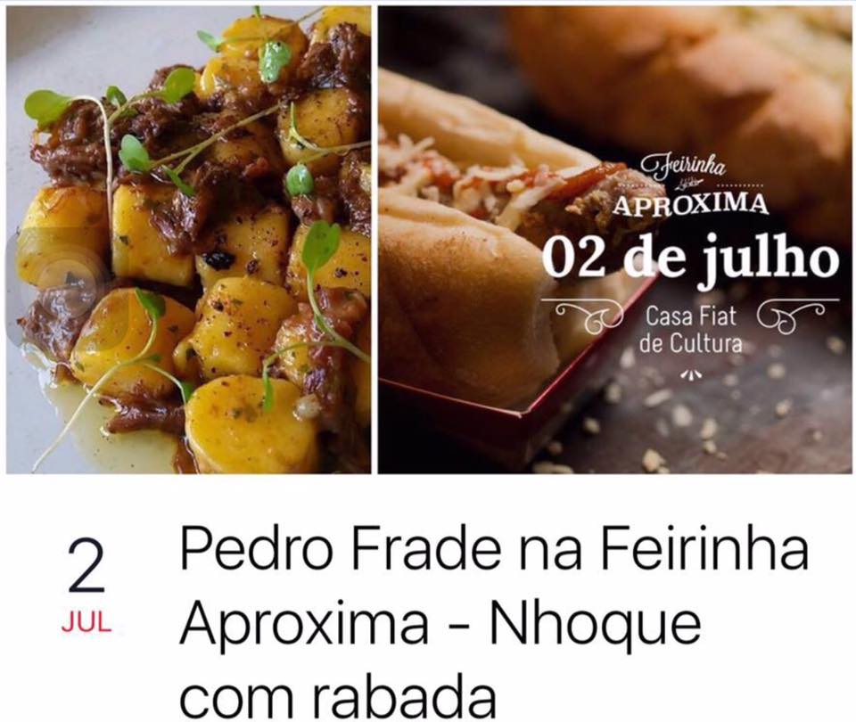 Olha quanta coisa boa dá para fazer hoje! Dá pra ir na Galeria Celma Albuquerque ver a exposição incrível do Nuno Ramos. Dali, a vontade é de esticar para a feirinha APROXIMA na Casa Fiat de Cultura, na Praça da Liberdade. Já falei dessa feira AQUI . Hoje, vou torcer pelo sucesso desse grande chef PEDRO FRADE , que está trilhando seu lindo caminho com muita garra. Ele vai servir NHOQUE COM RAGU DE RABADA. Não é uma delícia?