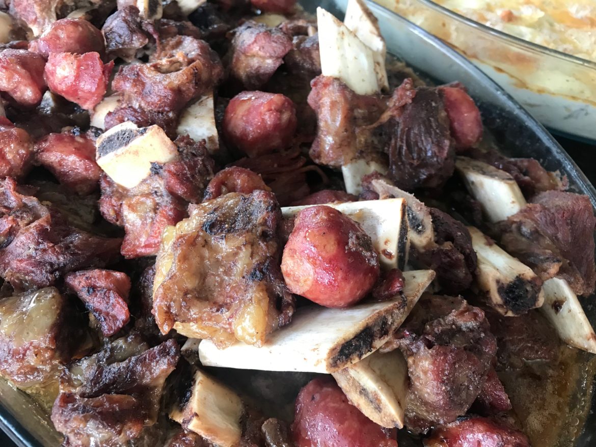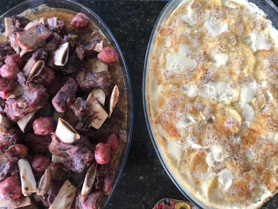 Sim, acredite, eu servi um comidão daqueles que faço aos Domingos, inspirada nos 2 restaurantes “chiquérrimos” que fui nessa semana em SP. Servi um costelão com batatas gratinadas, arroz e farofa temperada! É bom, viu??