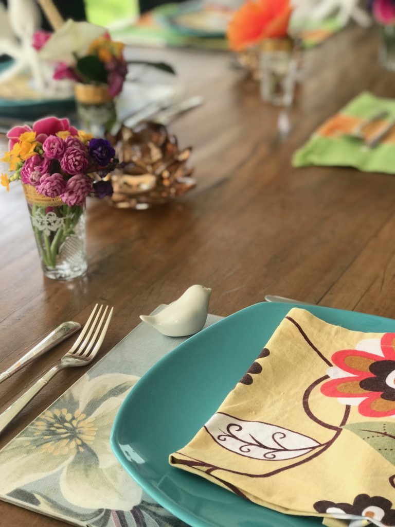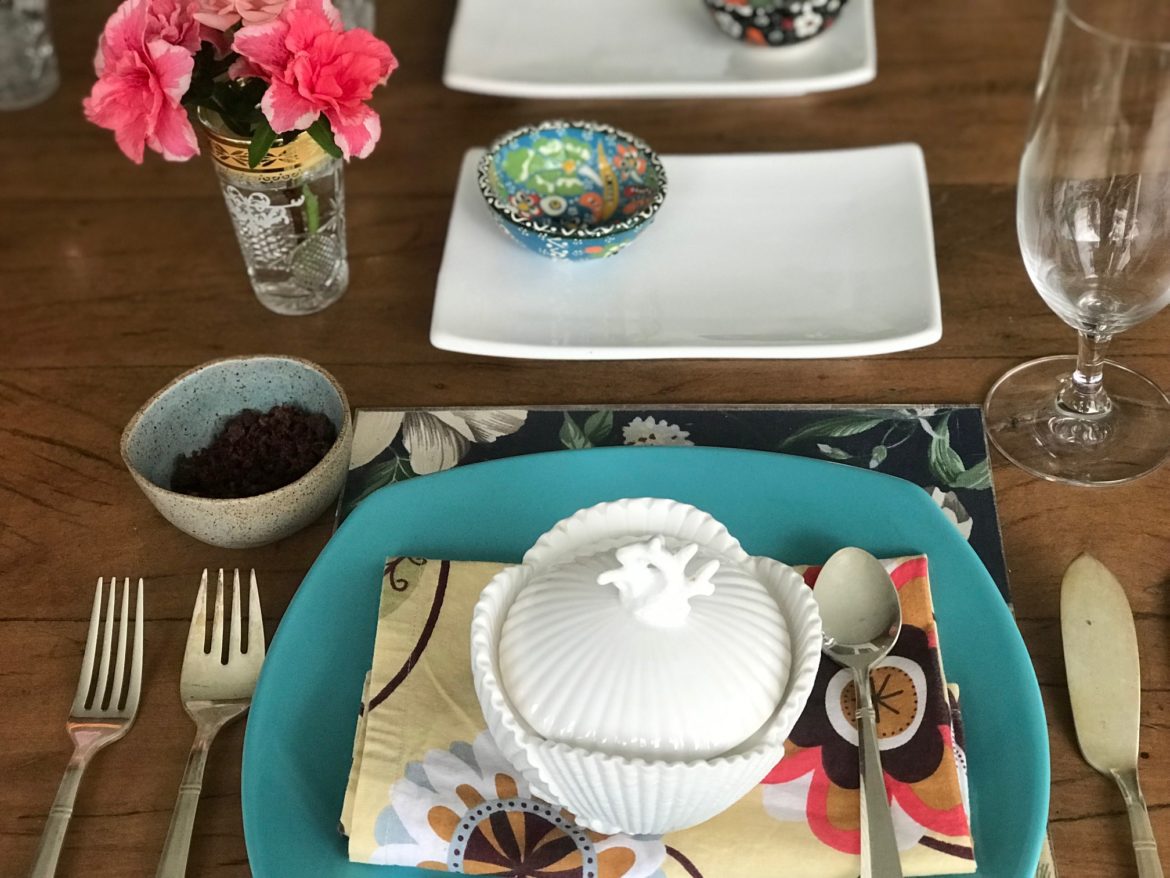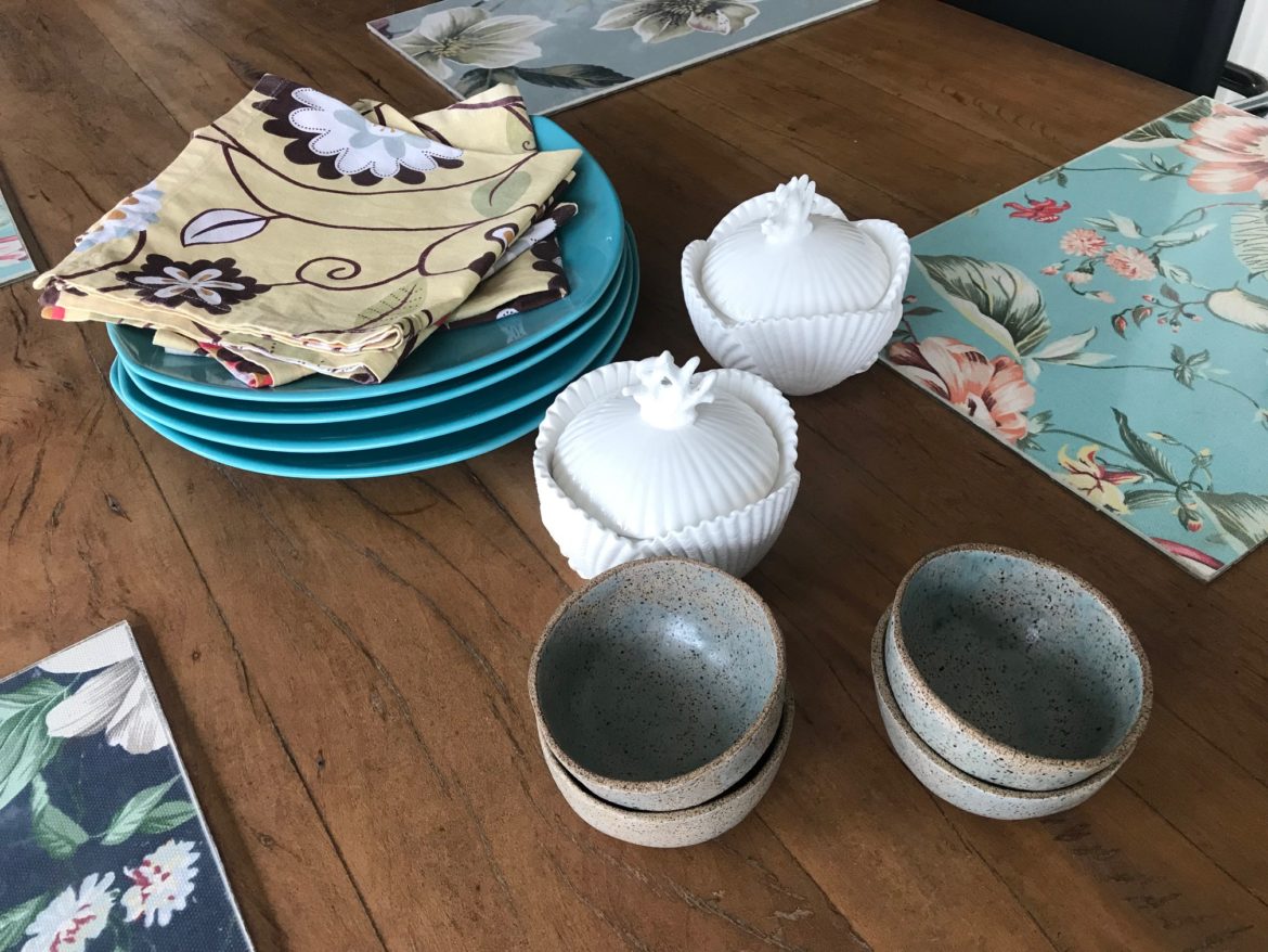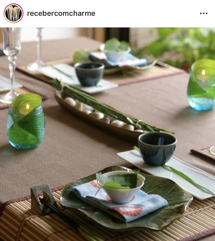 Comecei separando o vasilhame conforme a inspiração da foto abaixo do ig @RECEBERCOMCHARME . Gostei muito das cores e da forma como o guardanapo foi dobrado.