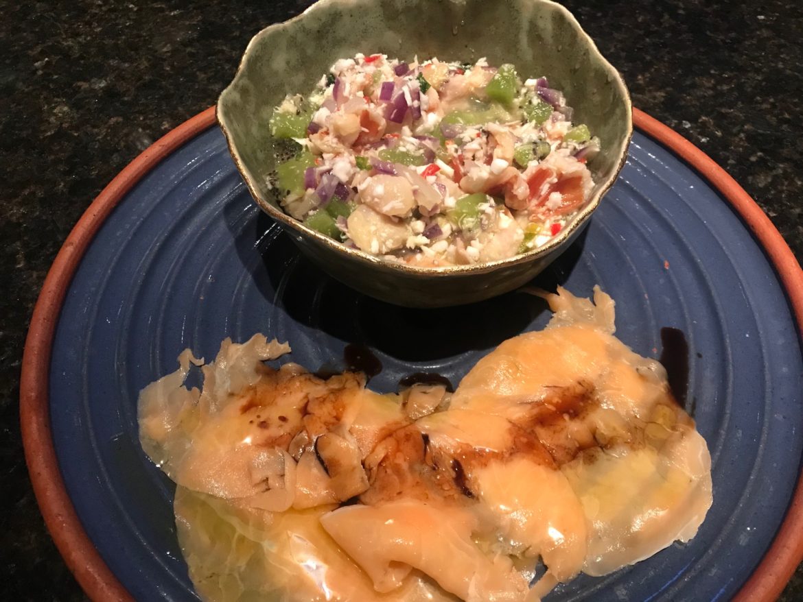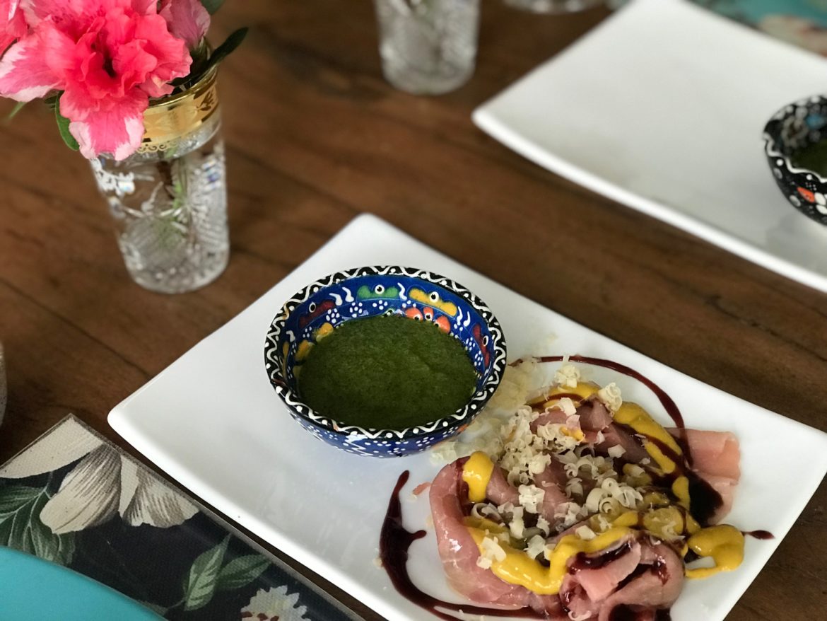 CEVICHE DE LICHIA com salmão defumado e carpaccio com PESTO DE ESPINAFRE servidos com pães.