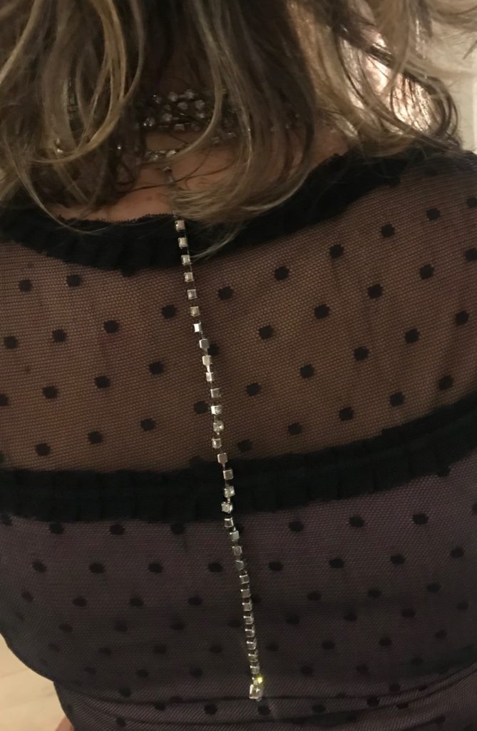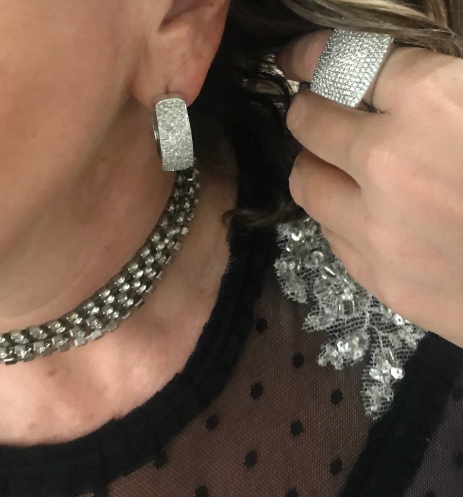 Misturei brinco e anel de brilhantes com um fio longo de cristais que enrolei no pescoço e deixei cair pelas costas.