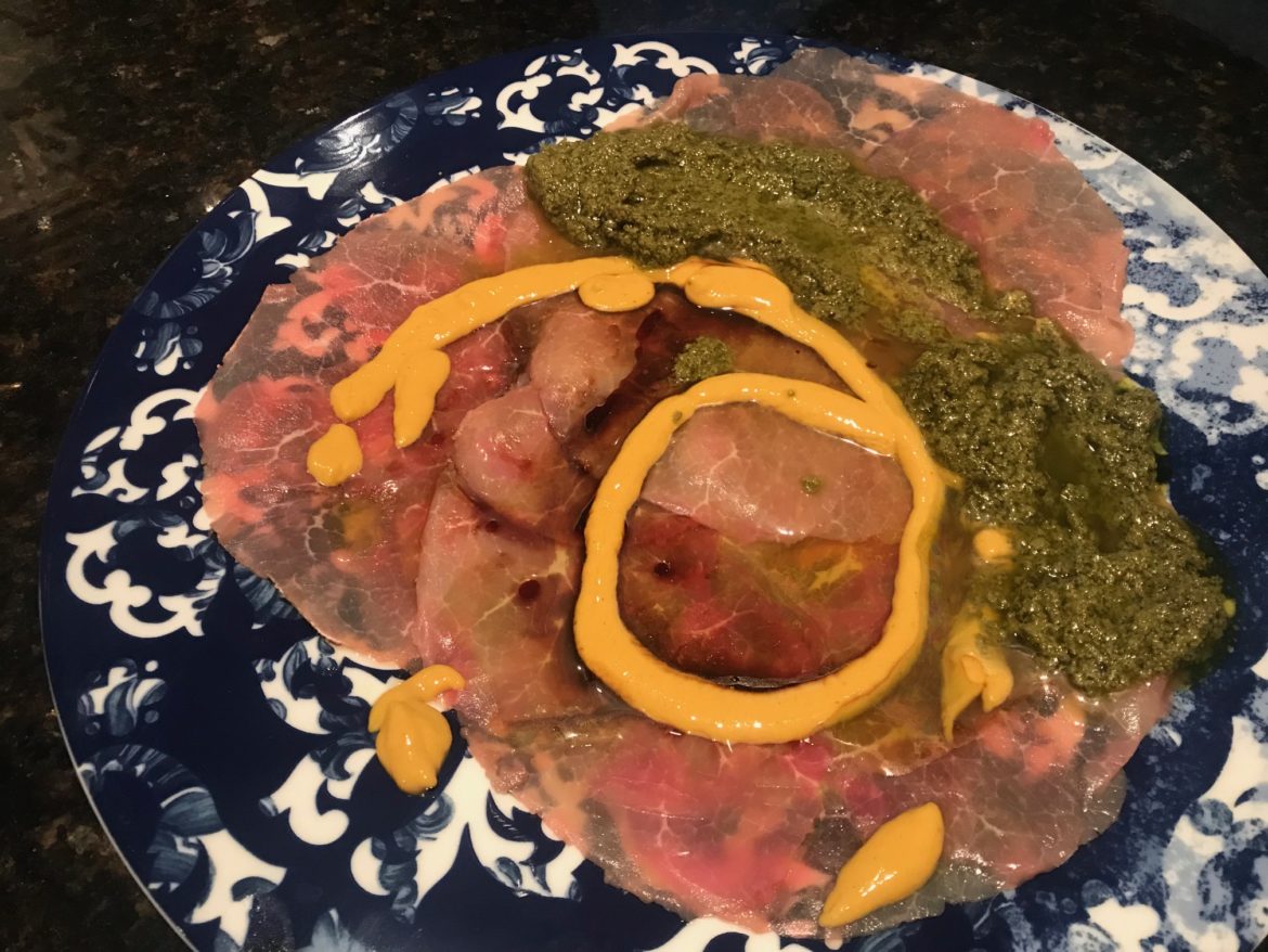 A segunda entradinha foi um carpaccio com PESTO DE ESPINAFRE que também já estava pronto. Apenas montei na hora, decorei com creme de aceto, mostarda, azeite e queijo ralado.