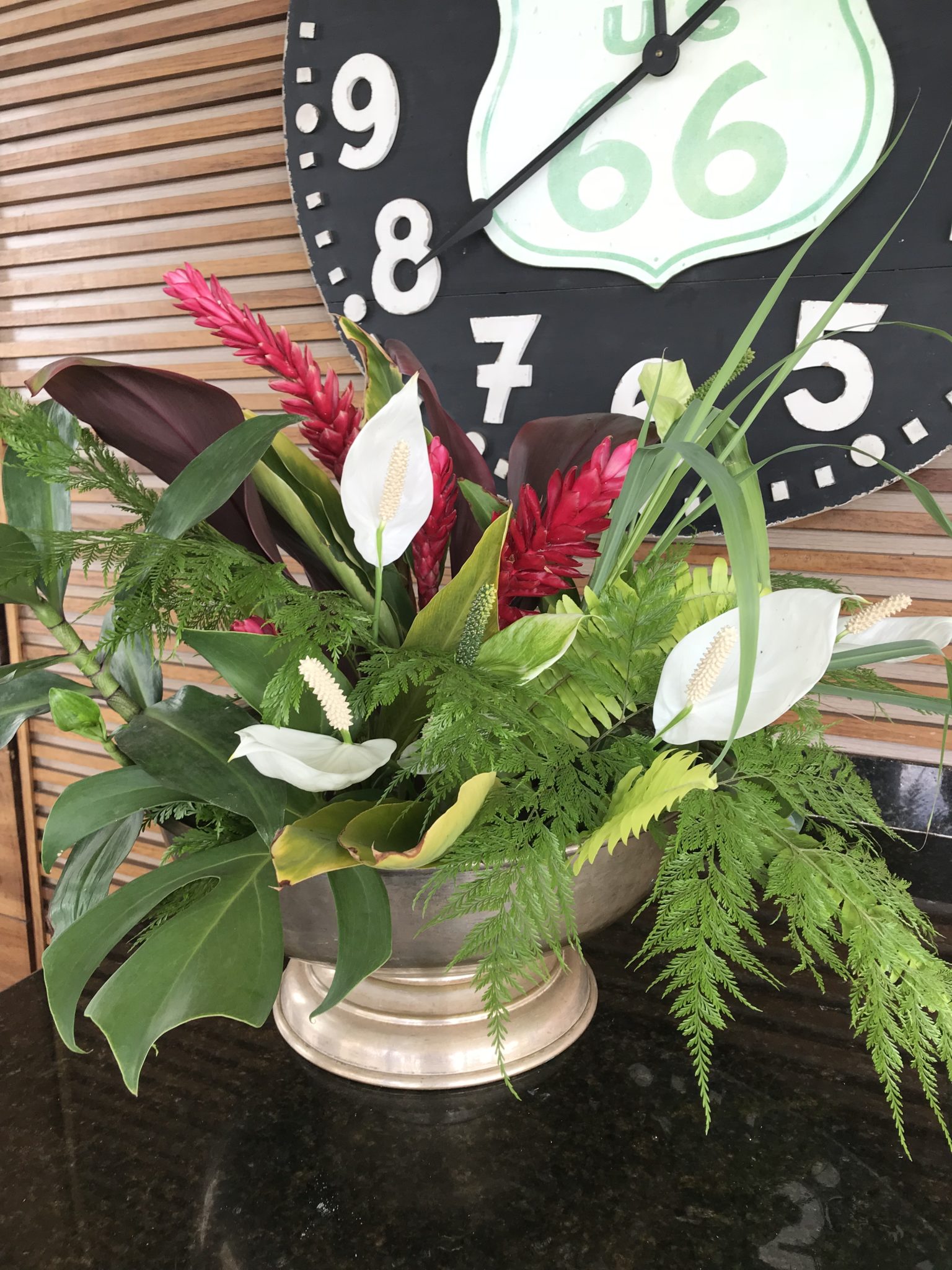 Usei essa champanheira de prata que já tem aquela estrutura para garrafas. Coloquei floral debaixo da estrutura e isso tudo ajudou a firmar as flores. Simples assim! Custo zero e rápido de fazer. Às vezes, a gente é que complica demais, concorda? E aí, acaba desistindo de receber.