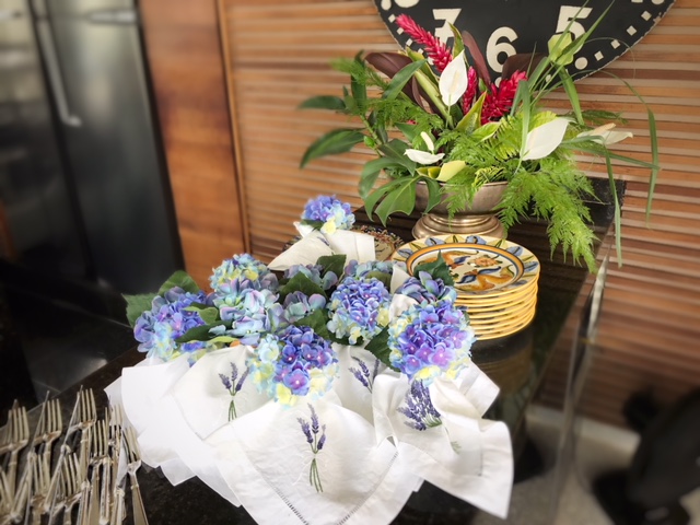 Empilhei meus pratos coloridos LUIZ SALVADOR  e coloquei um monte de guardanapos lado a lado. Montei um arranjo bem tropical com flores e folhagens daqui de casa mesmo.