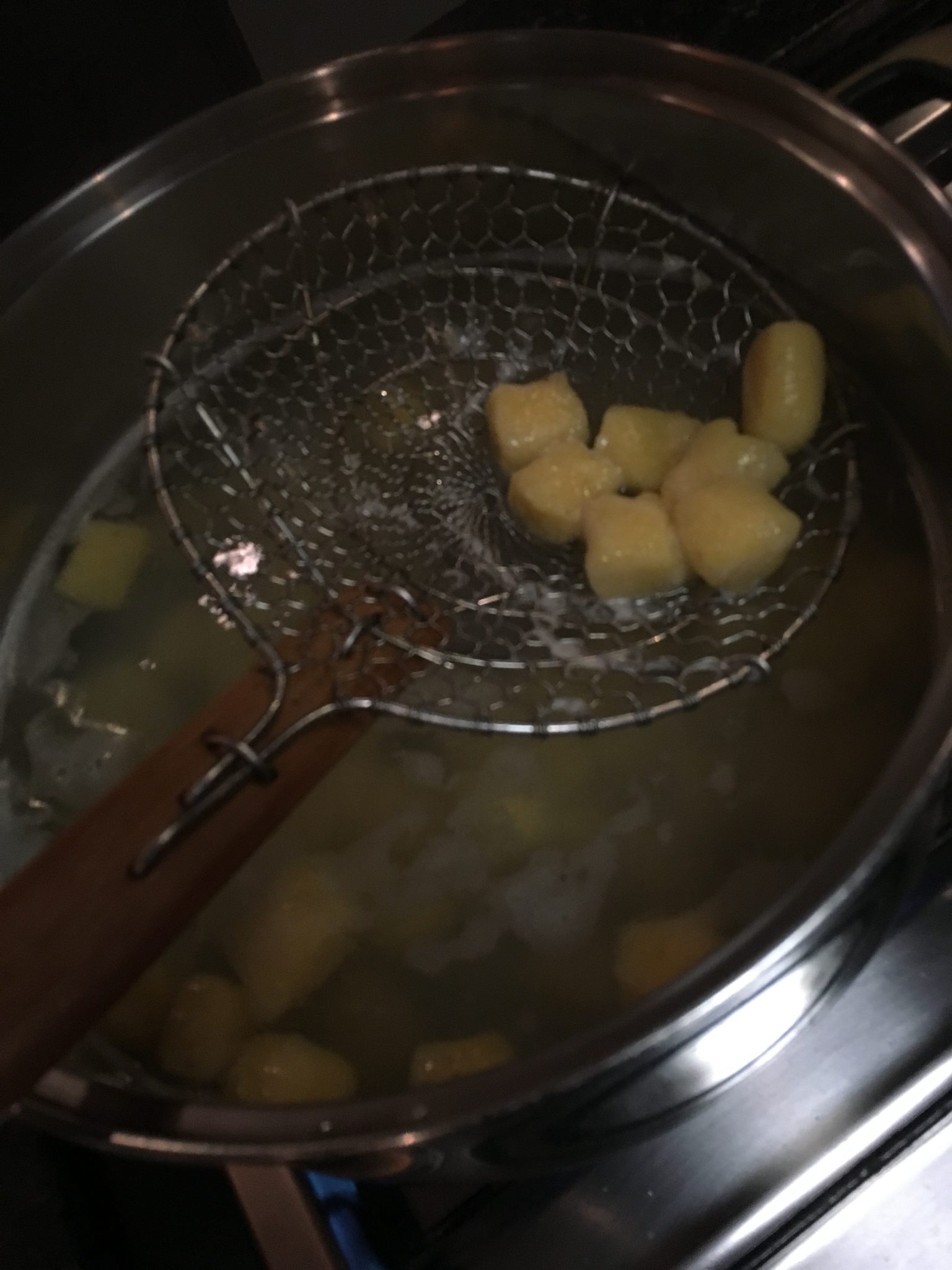 INGREDIENTES : 500g de batata baroa ; 80 a 100g de farinha de trigo; 1 gema de ovo; 50g de parmesão ralado; noz moscado; sal e pimenta-do-reino;