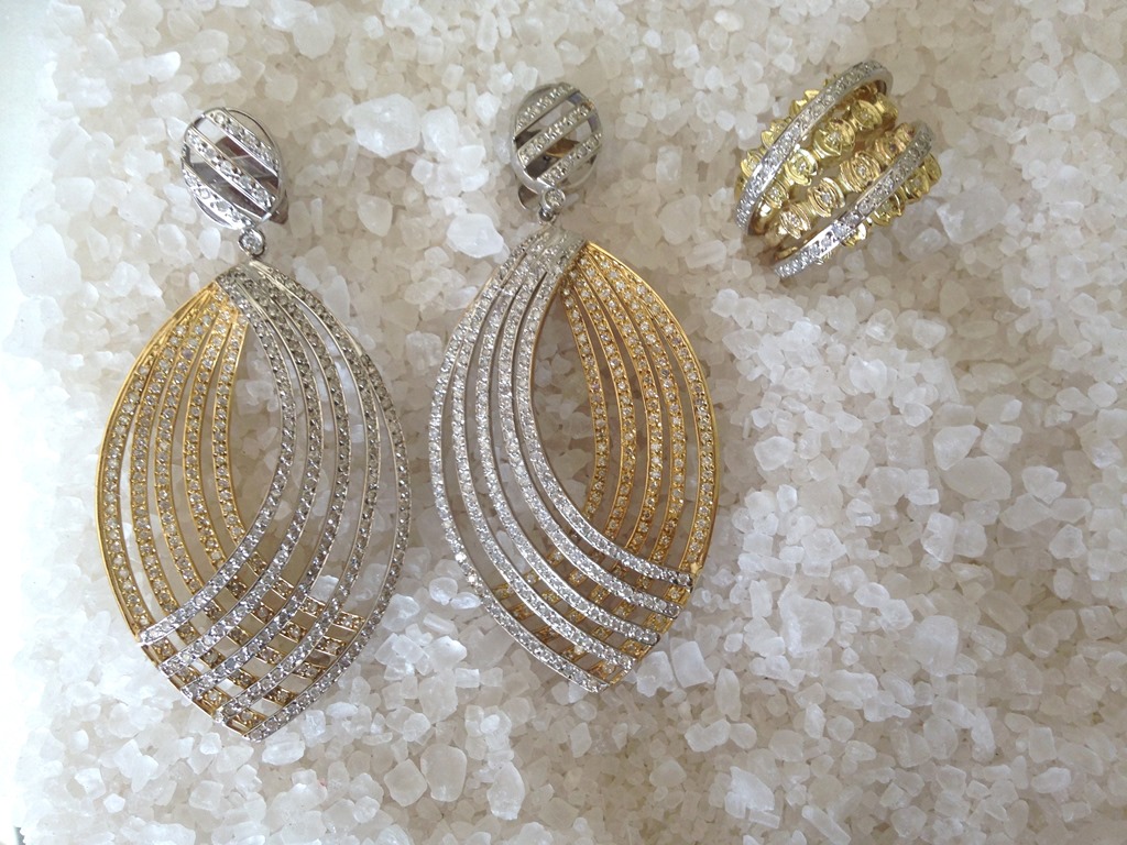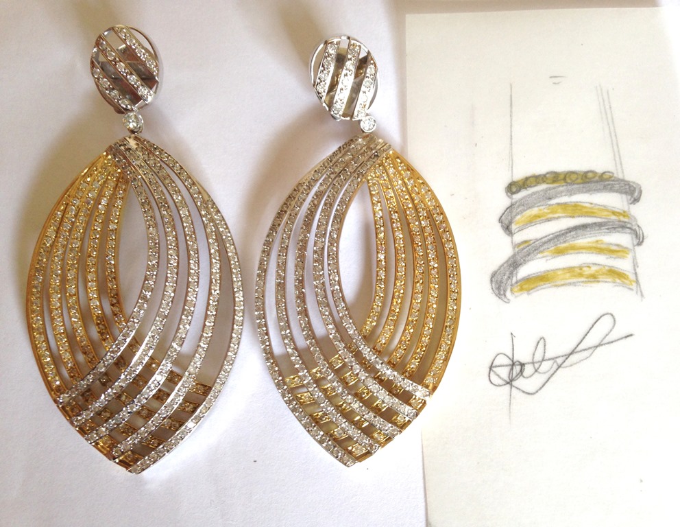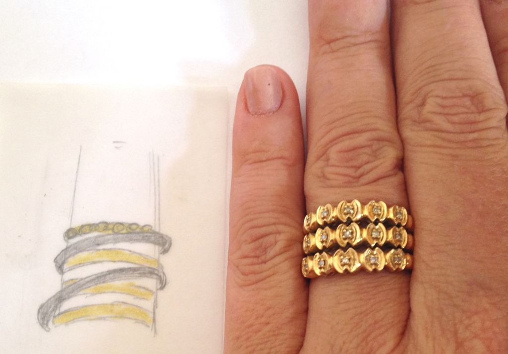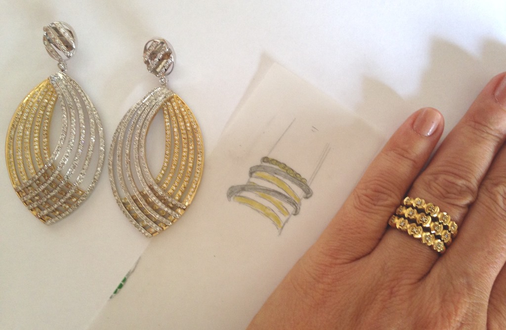 Achei que poderia sim ser aproveitado, pois o anel antigo já tinha aros, assim como o brinco. Faltava aumentá-lo, dando importância à peça e introduzir ouro branco e brilhantes para fazer o conjunto. Foi nisso que pensei ao desenhar a nova peça.