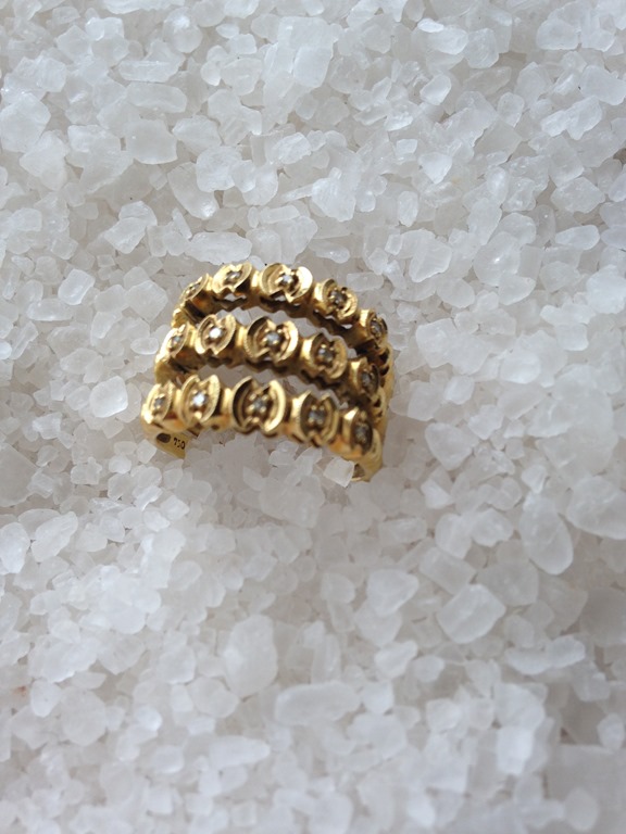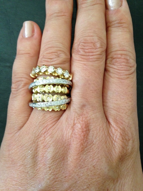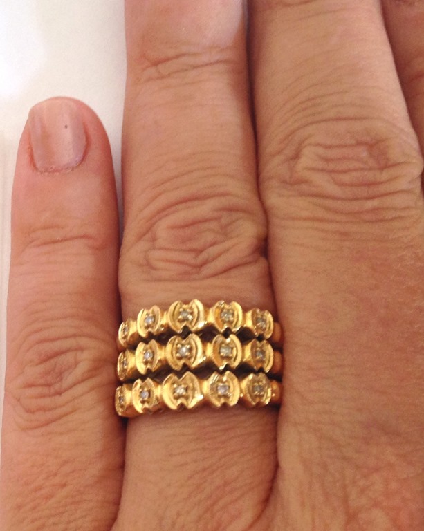 Mandei essas novas fotos , e na última coloquei uma aliança de brilhantes extra para ela ver se era esse tamanho que ela gostaria. E ela amou! Partimos então para mais um aro de ouro como o do antigo ( dos 3 aros originais , passamos para 5 ! ) e passamos mais um aro de brilhantes, dando ainda mais corpo, altura e imponência ao anel! E ele ficou assim!