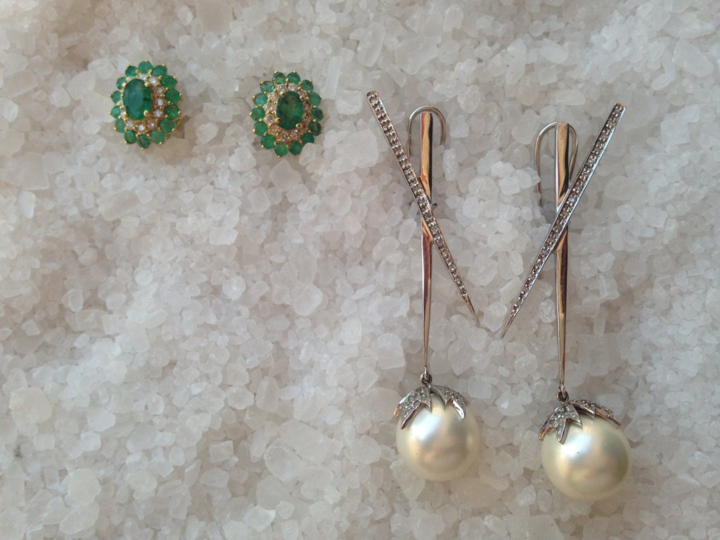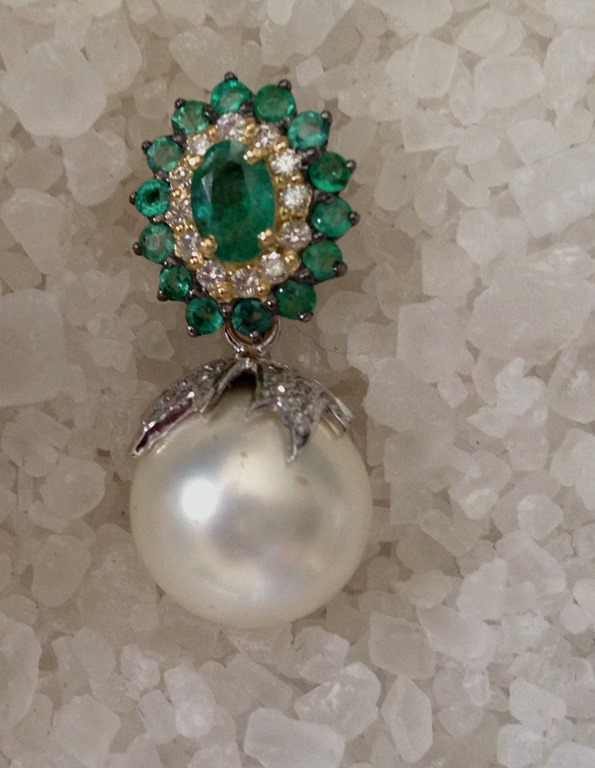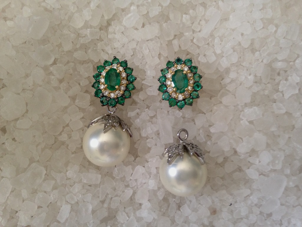 Recebi esse brinco que andava “ encostado “ no porta-jóias de uma cliente, e como ela amou esse de esmeralda agarradinho na orelha, pensei em adaptar a pérola dela nele, e fazer de por-e-tirar para ficar multi-uso.