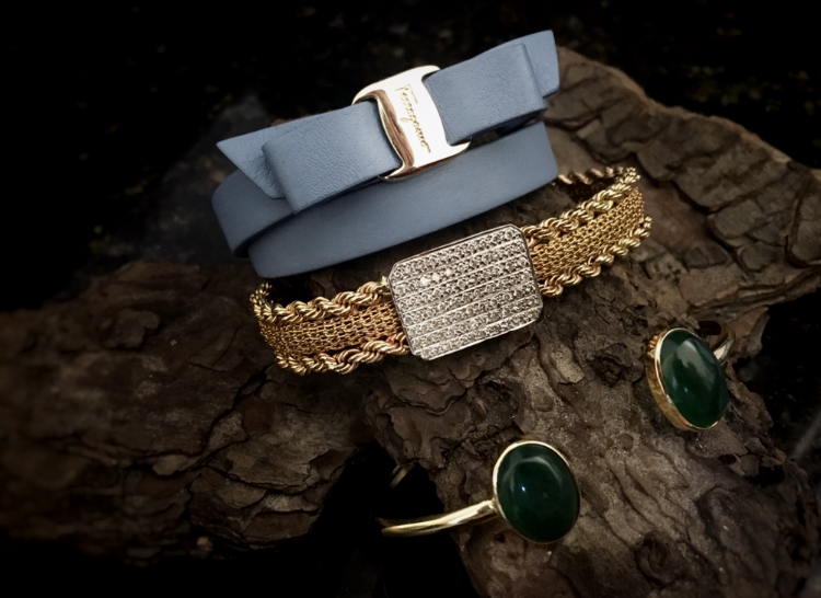 Eu adoro misturar cores e materiais. O bracelete de couro azul da FERRAGAMO deu bacaneza à composição com uma pulseira em jade e outra em brilhantes, ambas em suporte de ouro amarelo.