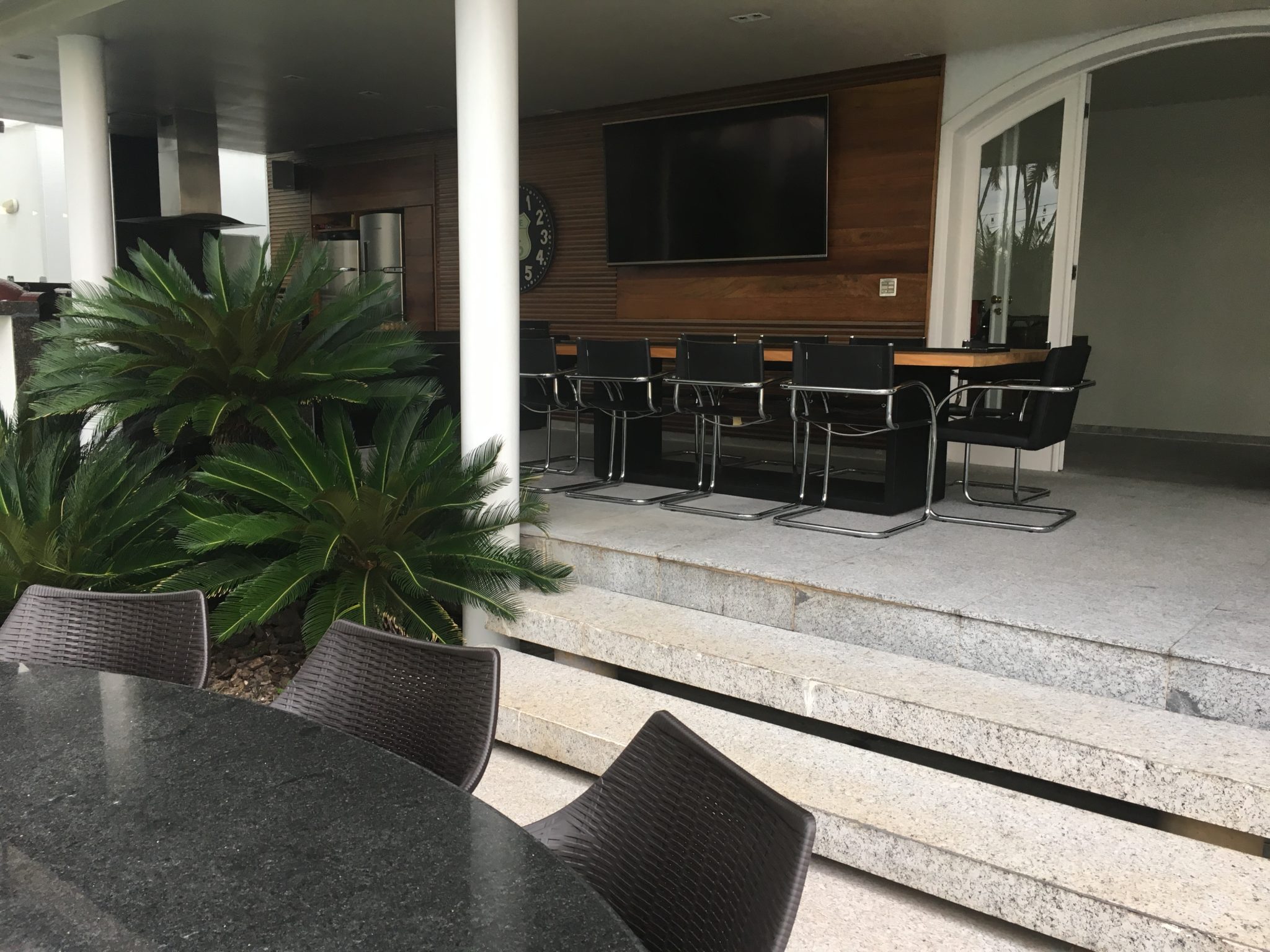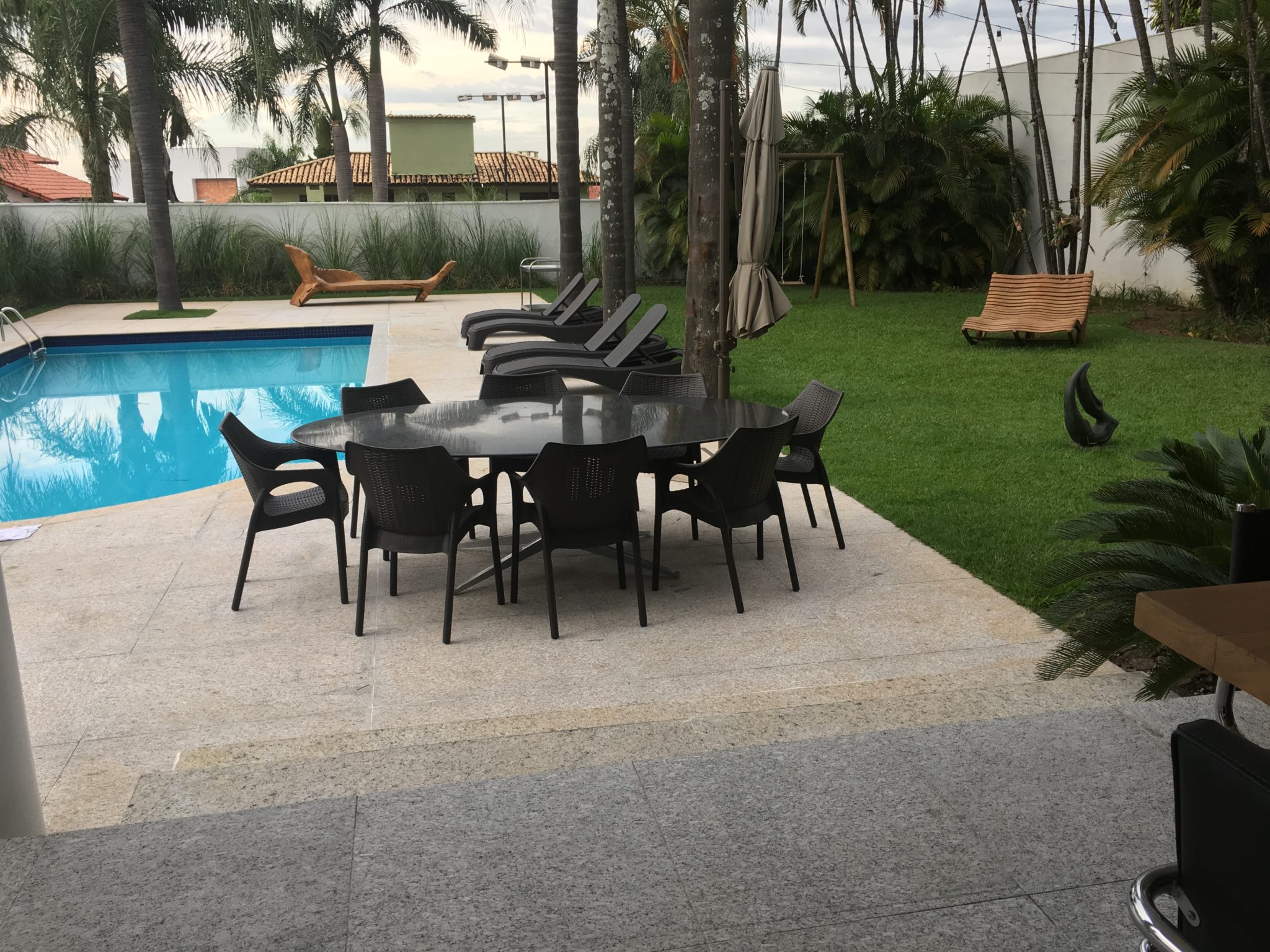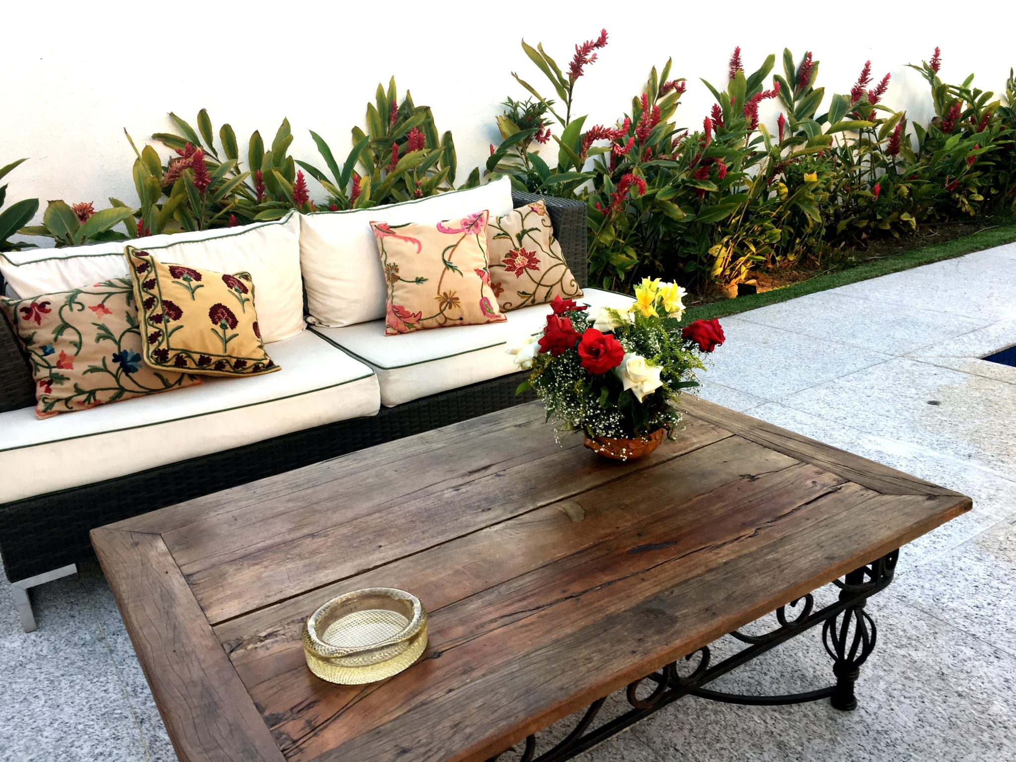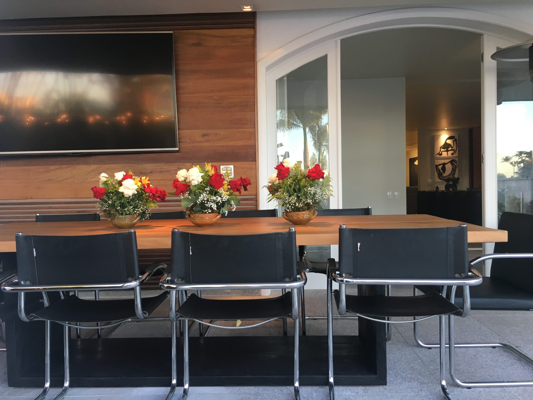 Tenho percebido que mesmo quem mora em apartamentos, aproveita bastante a varanda. Uma amiga fez uma obra gigantesca agora, onde? Na sua varanda, para integrá-la à sua sala com mais conforto e beleza, já que todo mundo fica lá mesmo! Aqui em casa, as 3 refeições são na varanda, acreditam?? rsrs E os amigos não querem outro lugar! Pensando nisso, trocamos nossa mesa anterior de 8 lugares por uma de 10, e aproveitei para usar madeira de demolição, fazendo uma combinação com a parede de lambris do fundo. Mantive cadeiras pretas e desci com a mesa preta para a àrea de piscina. Granito funciona bem fora, pois resiste ao tempo. Cadeiras de fora troquei por café, menos escuras do que preto, mas mantendo uma certa linha com todo o entorno. Que tal?