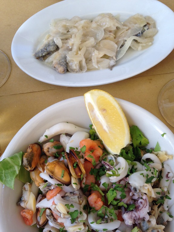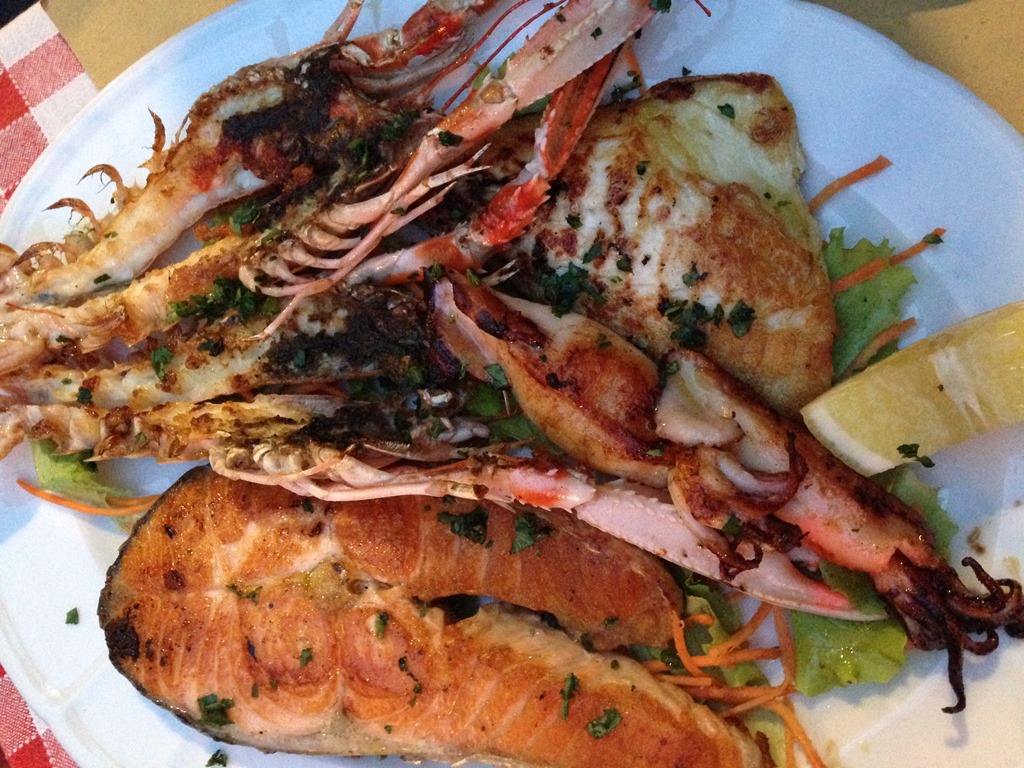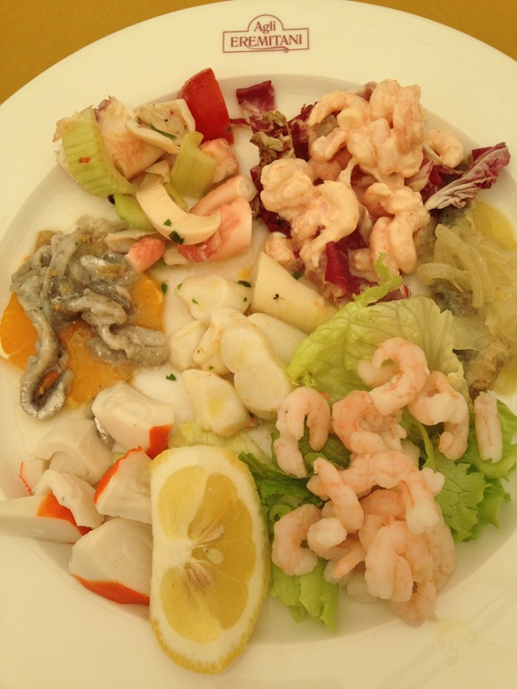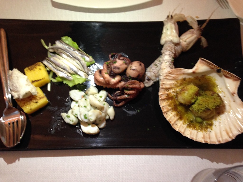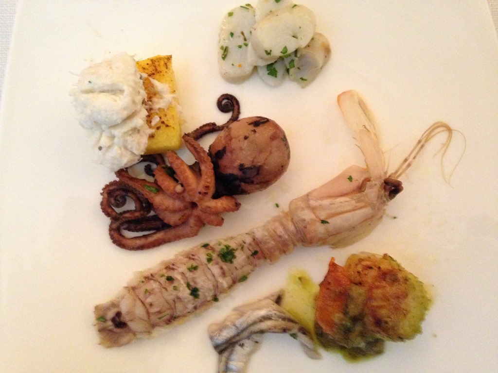 As entradas –ANTIPASTI- são maravilhosas acima de tudo, pelos deliciosos e fresquíssimos frutos do mar disponíveis. Ah! e tudo vem com polenta – que eu não amo –  bem como sempre  acompanhado de prosseco do Veneto, ou vinho branco soave, o vinho deles.