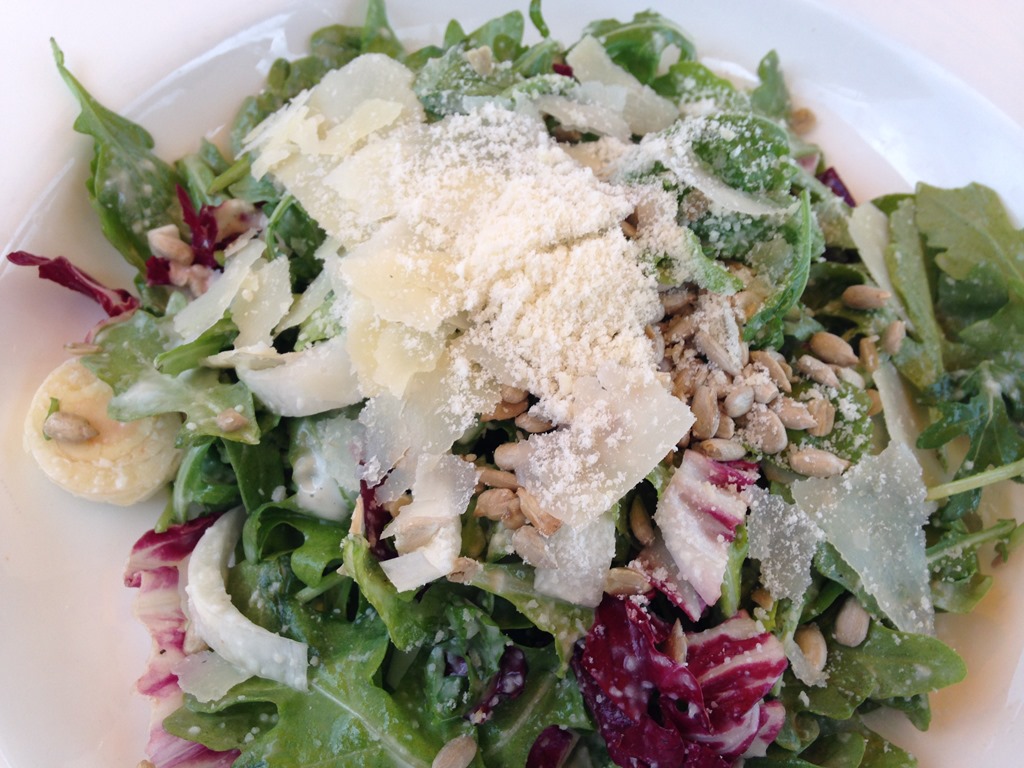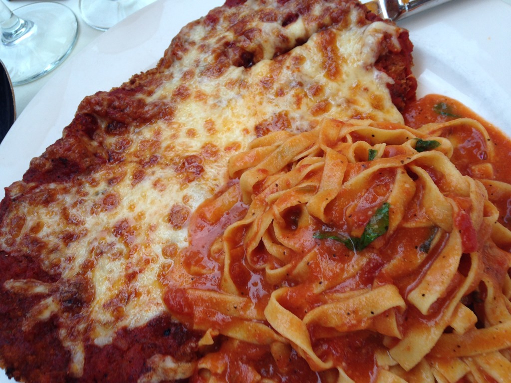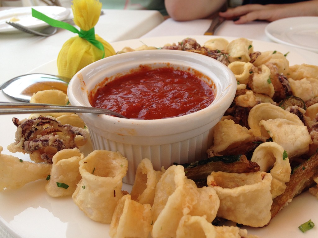 A comida – simplesmente a autêntica comida italiana, idêntica à que acabei de comer em Veneza em maio – calamari fritti, cottoleta milanese, risoto, salada de rucula, tiramissu