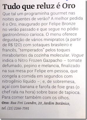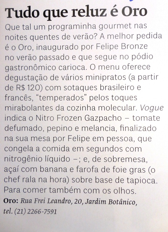 – Oro, do Felipe Bronze (é o que tem de mais novo no Rio e esse chefe está super na moda);