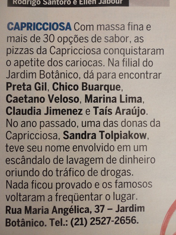 A Capricciosa é uma pizzaria DOC com filiais no Rio (Ipanema, Copa, Jardim Botanico …) Eu fui na de Copacabana , num prédio antigo, pequena e deliciosa, como sempre!