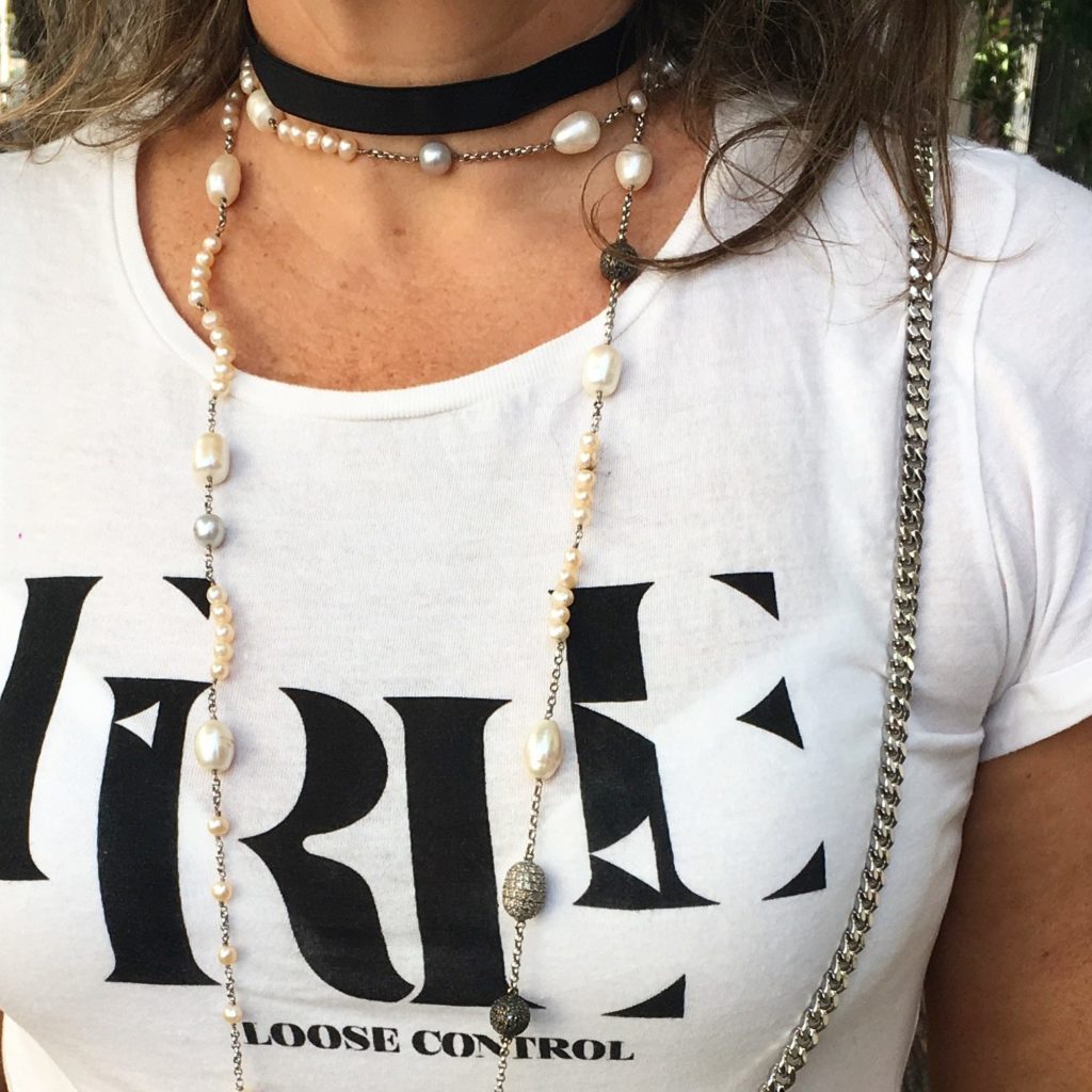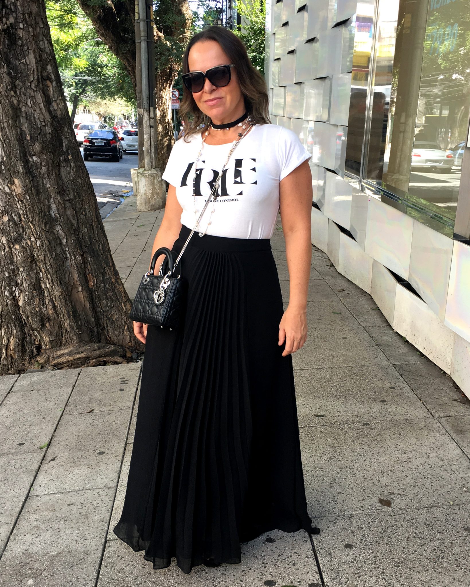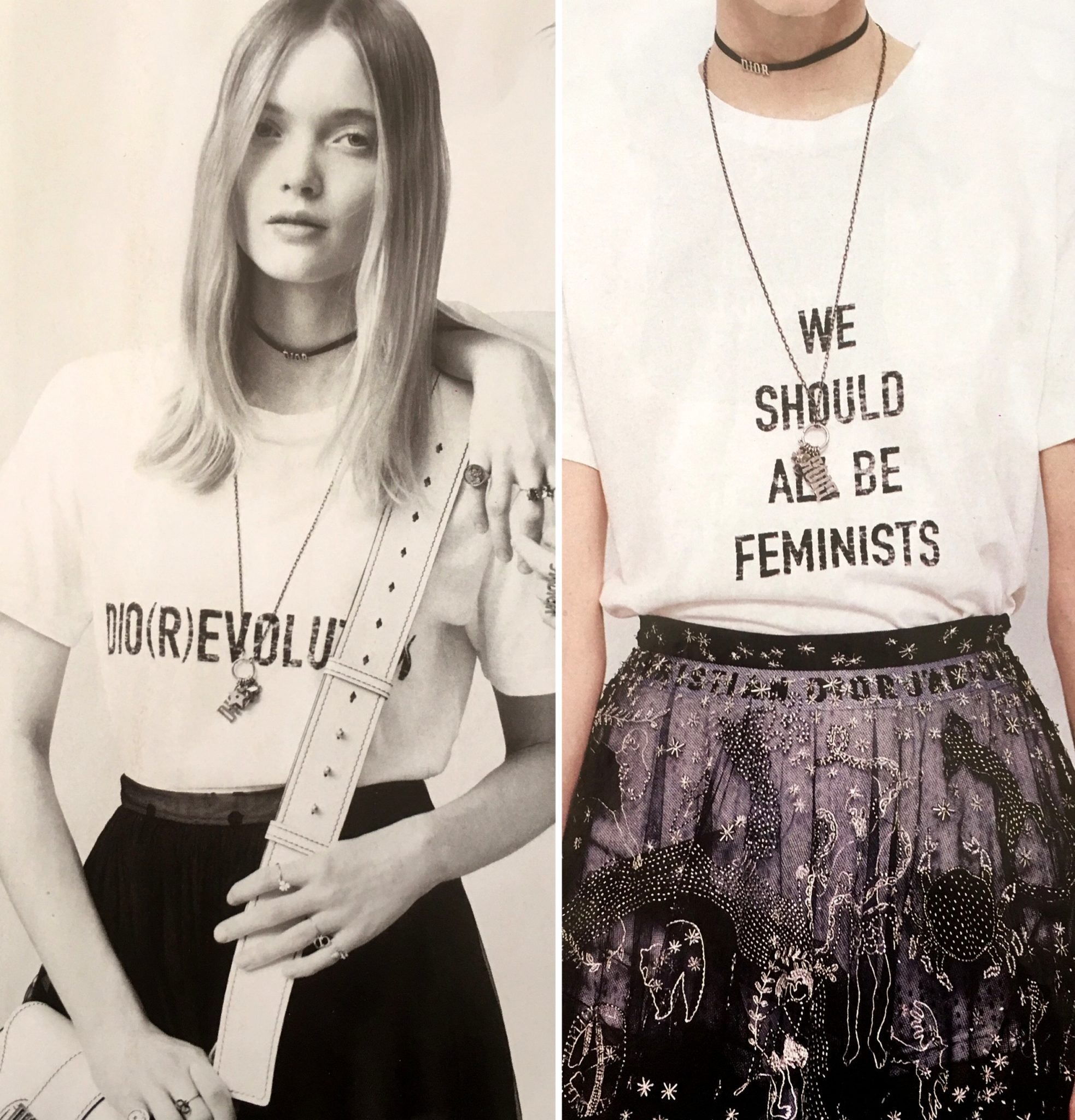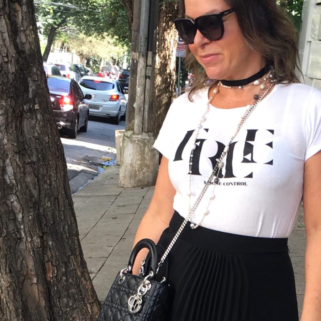 Foi a DIOR que colocou essa idéia linda nas passarelas e caiu direto na graça das fashionistas do mundo todo. A idéia é você vestir uma “camiseta statement” com uma frase que te represente. É um hi-lo glamouroso porque você usa uma camiseta “podrinha” com uma saia elegantérrima, coloca uma choker pretinha tipo nada e arrasa no colar longo. Eu já tinha tudo, gente! – ” believe me or not! ” – e aposto que você tem também.