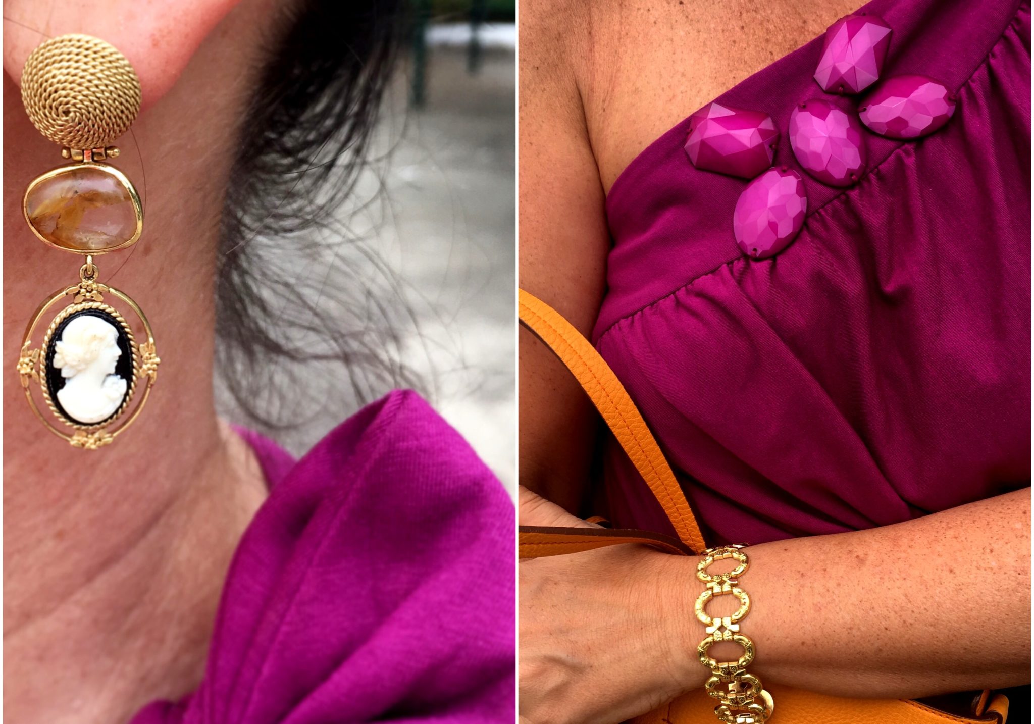 Essas mesmas joias ornaram outro look-dia, também colorido como o de cima.