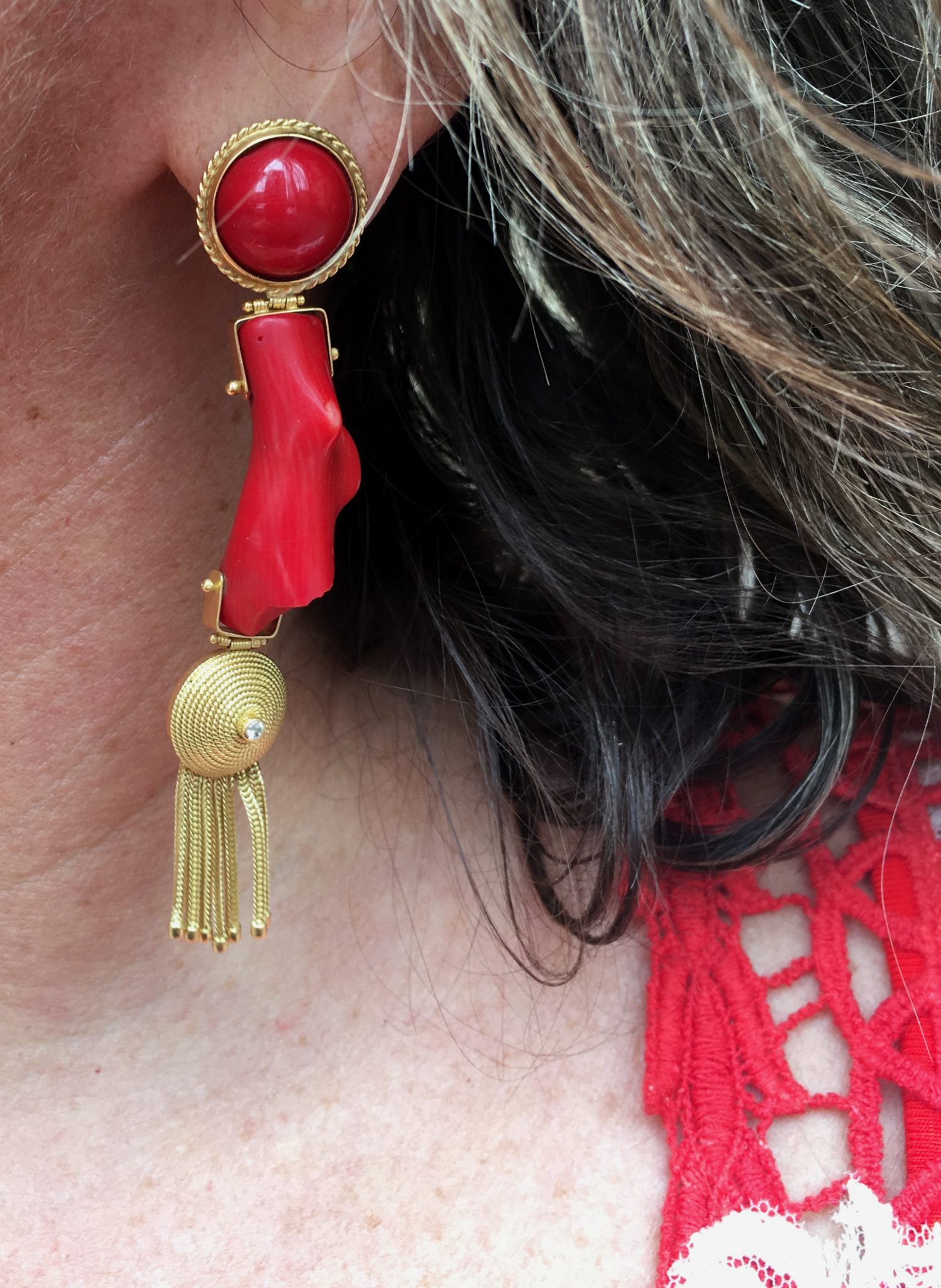 No 1o. look-dia, apenas um brinco em coral vermelho em ouro amarelo.